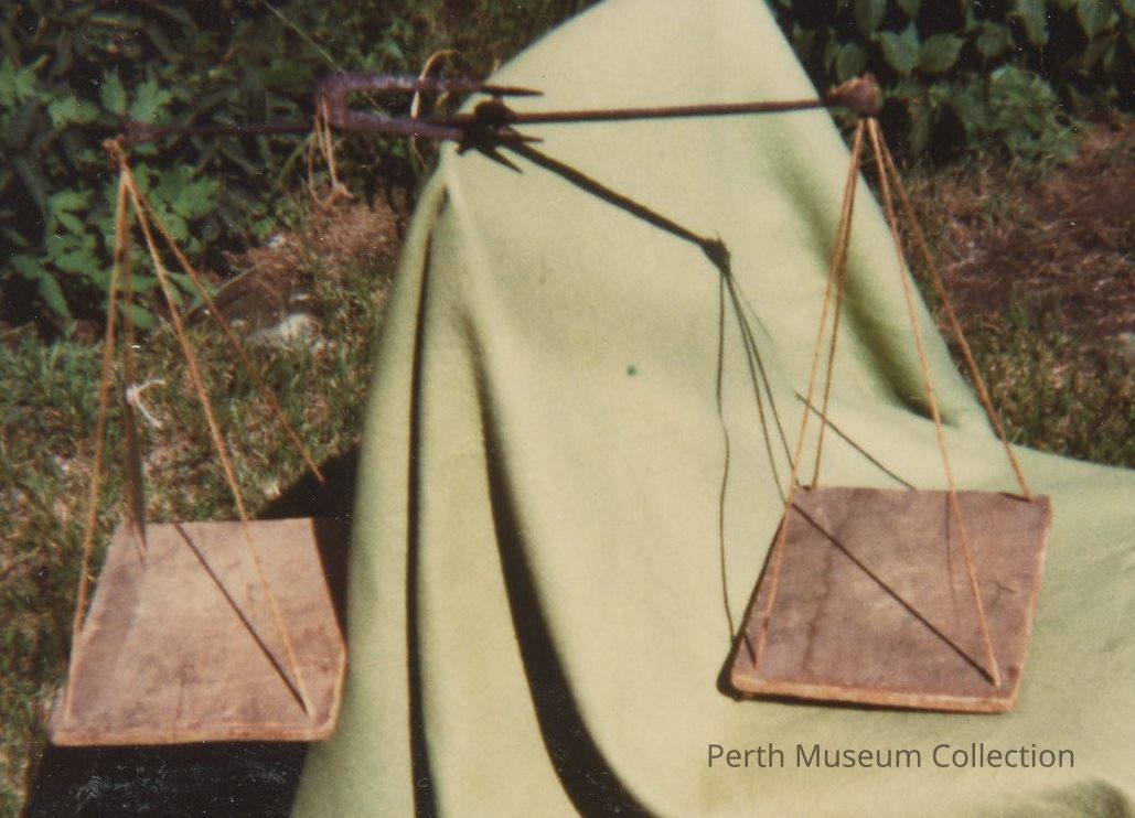 Purchased by the donor at the sale of belongings of Alexander McGarry, hotel keeper Innisville Drummond TWP Lanark County Ont. This old time apparatus for weighing groceries. Consisting of a poised beam with two opposites homemade substitute for the usual metal dishes(?) or scales may have been first used in a pioneer store. It has two wooden boards which are secured by string and attached to an Iron handle.