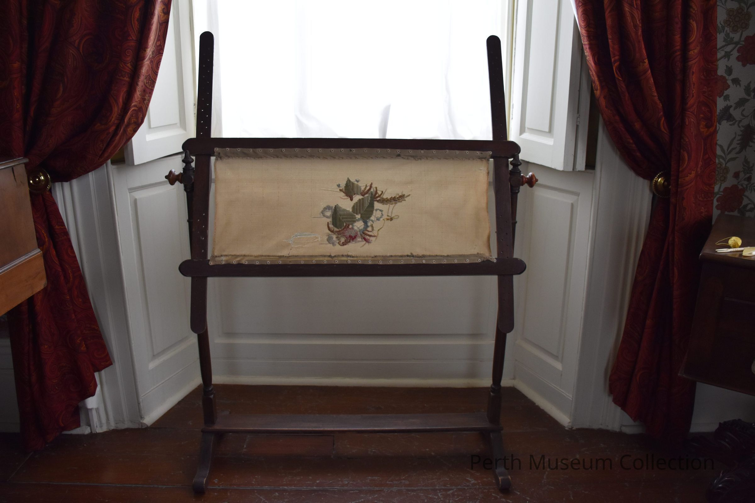 This walnut needlepoint work frame was used by ladies of the 19th. century to hold their needlework in drawing rooms. Usually used for fancy work. This frame still holds an unfinished panel of embroidery of framed leaves and flowers. It has been resewn to the frame and has a large rent in the background netting. The frame portion swivels and is held constant with two turned knobs at either end and pegs were used in the holes of the framework to keep the frame in place. This frame is in quite good condition.