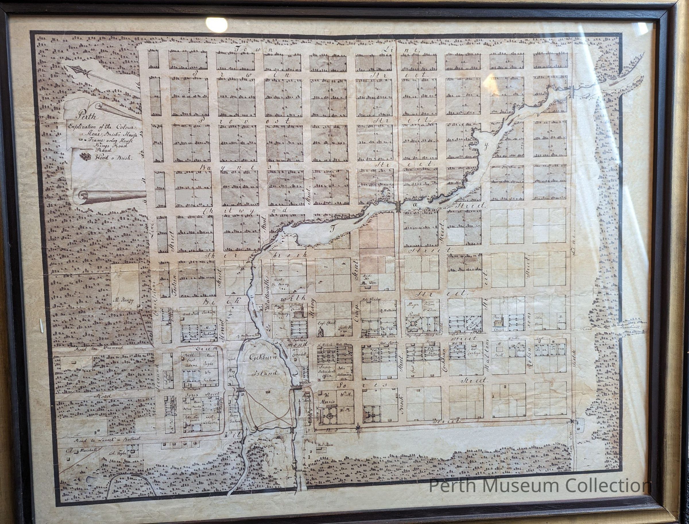 Framed with glass. Hand drawn on what looks like tissue paper. This map indicates who lived in what house, and in some cases the profession of the home owner (E.g.. Doctor Thom, Col. Taylor). Presently located in the Tourist Information Centre of the Perth Museum (Matheson House).