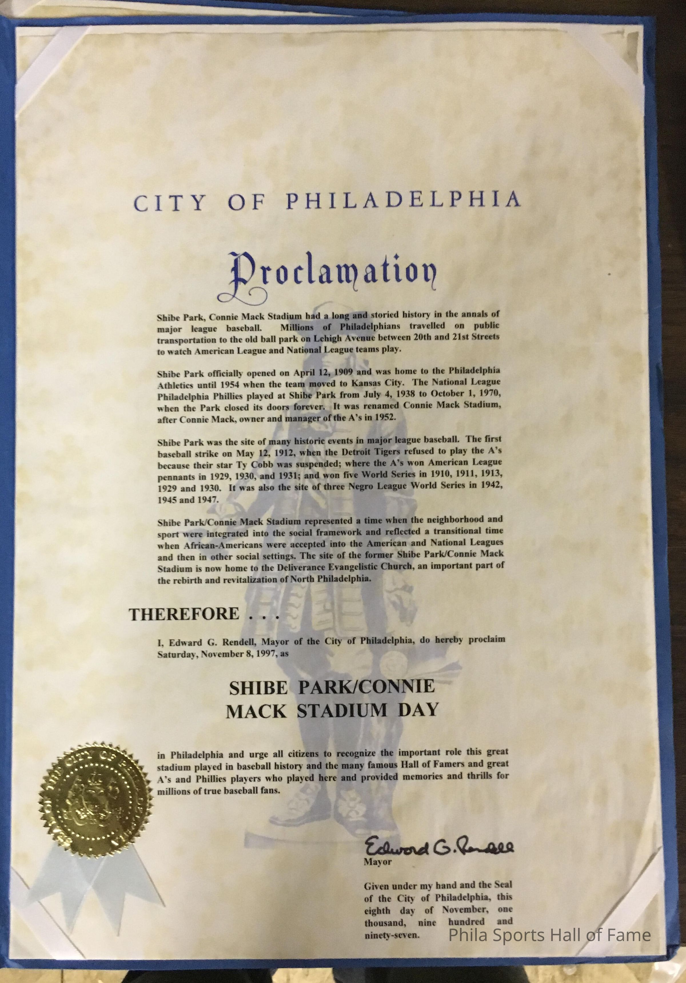 1997 Shibe Park - Connie Mack Stadium Day City of Philadelphia proclamation