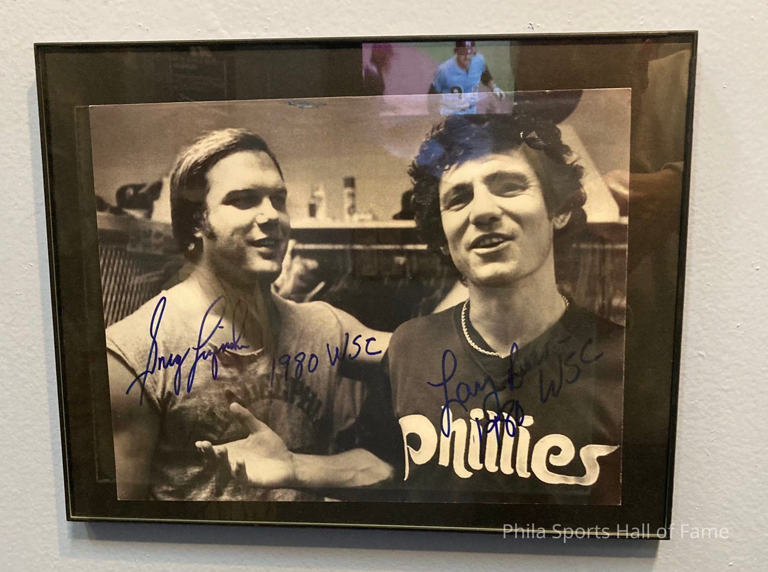 Signed photo of Larry Bowa and Greg Luzinski from a locker room with "1980 WSC" written. Bowa and Luzinski were key pieces to the 1980 World Series Championship team. Both are Philadelphia Sports Hall of Fame inductees and members of the Phillies Wall of Fame.Collection