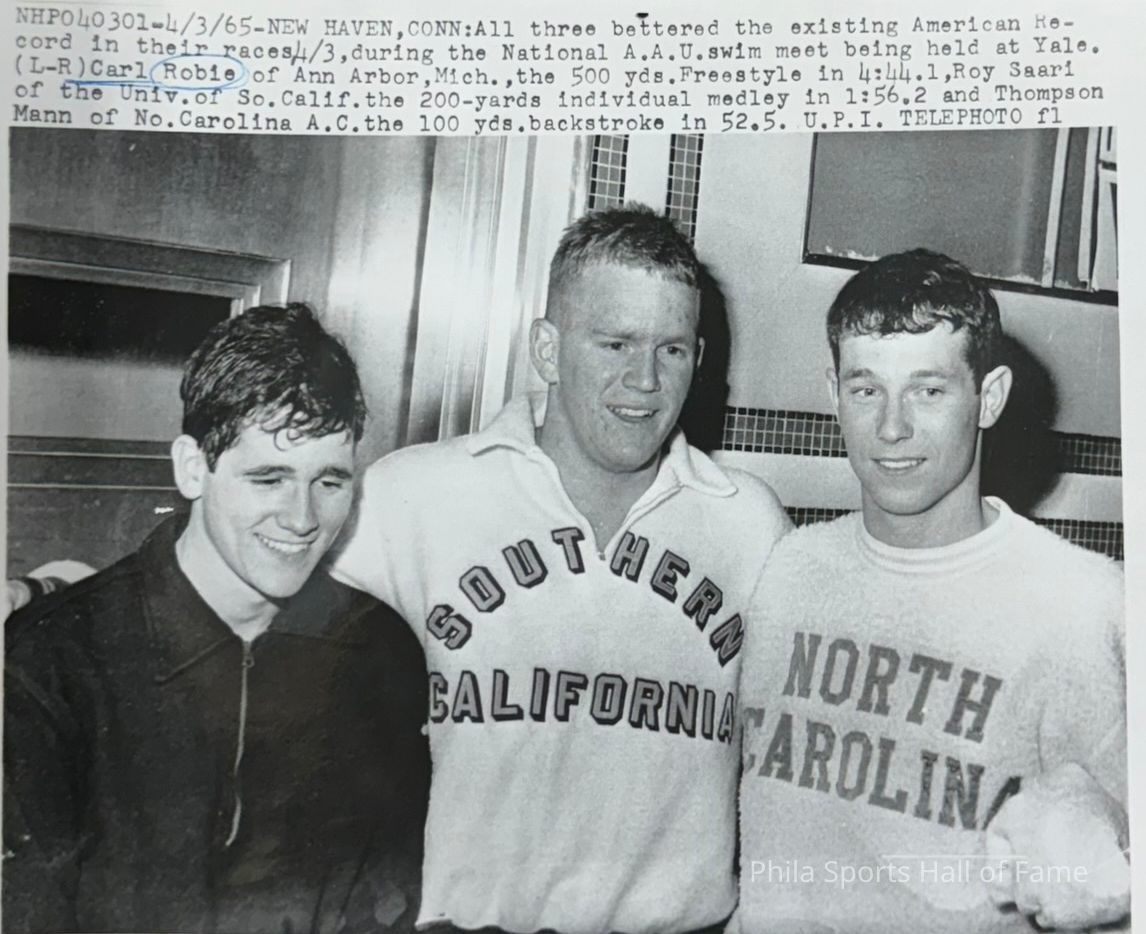 Press photo of Carl Robie after setting American record in the 500Y freestyle at the 1965 AAU National Championships at Yale in New Haven CT