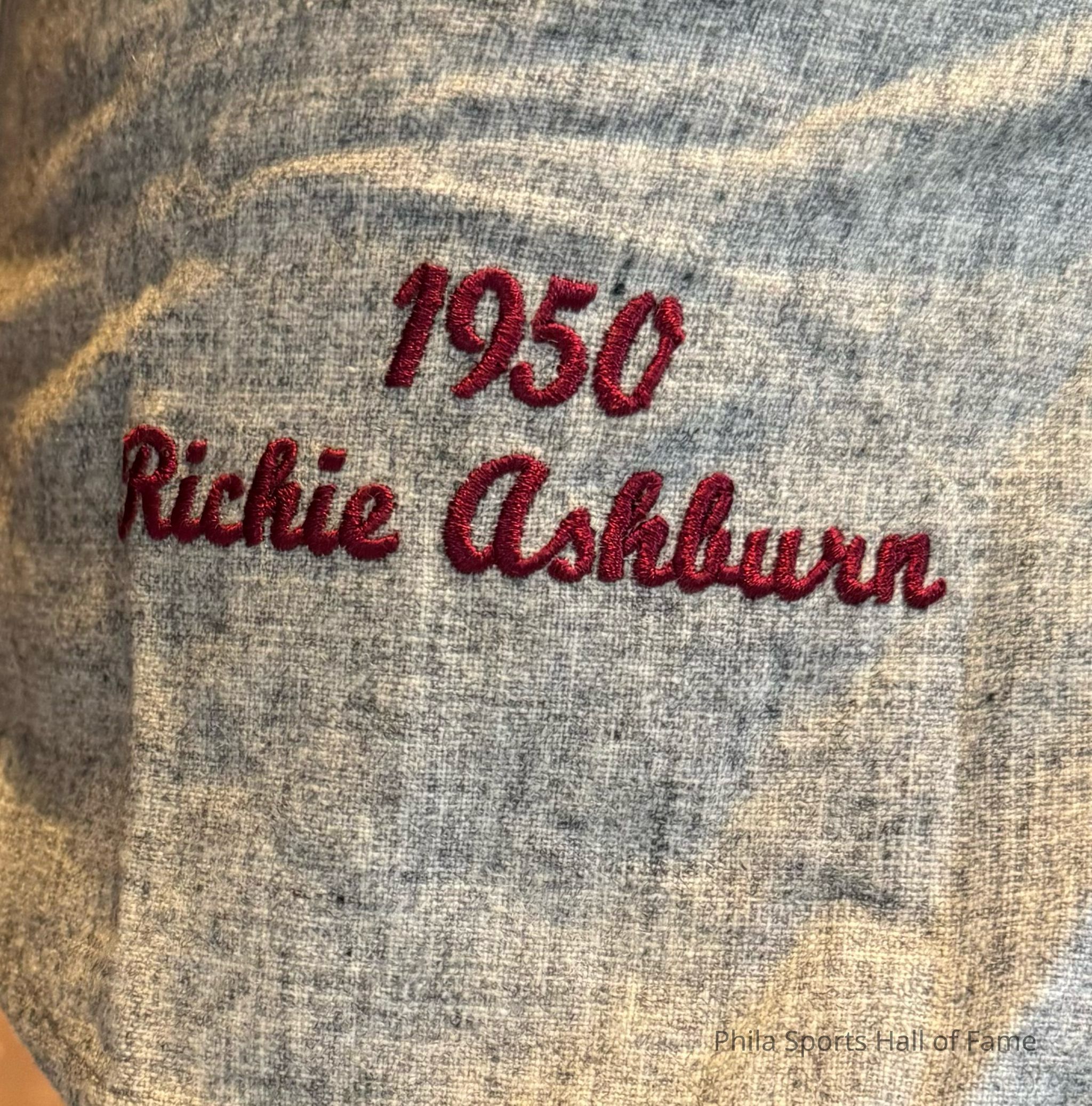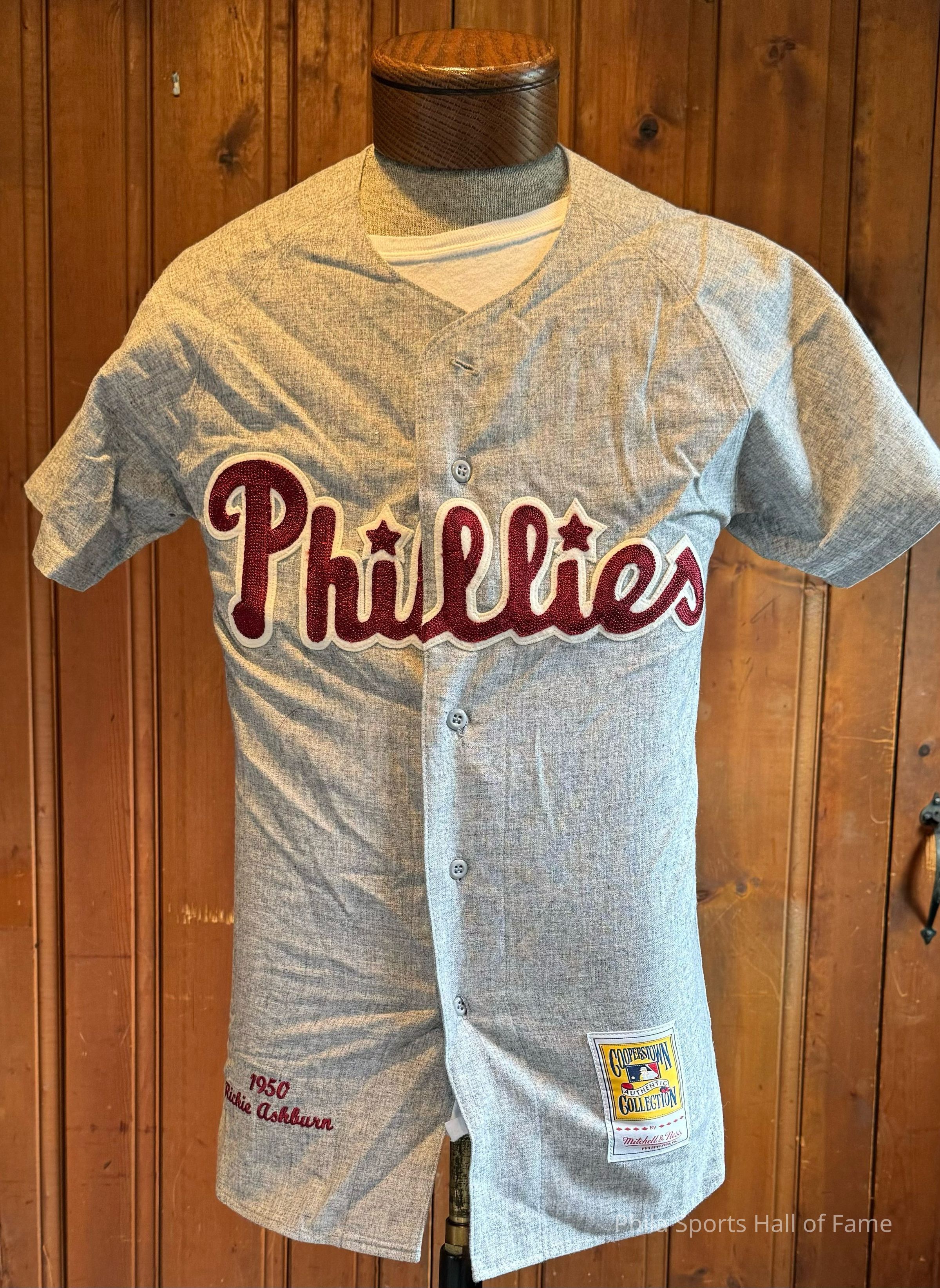Richie Ashburn 1950 Phillies #1 jersey (authentic reproduction). Richie Ashburn played center field for the Phillies from 1948-1959. He is one of the all-time greats in Phillies history. He was a member of the "Whiz Kids" who won the 1950 NL pennant. He made 4 all-star games while playing in Philadelphia and led the league in batting twice. His #1 is retired by the Phillies and he is a member of the Baseball Hall of Fame. After he retired he joined the Phillies broadcast team in 1963 where he served until he passed away in 1997. He was part of the inaugural induction class of the Philadelphia Sports Hall of Fame.Collection