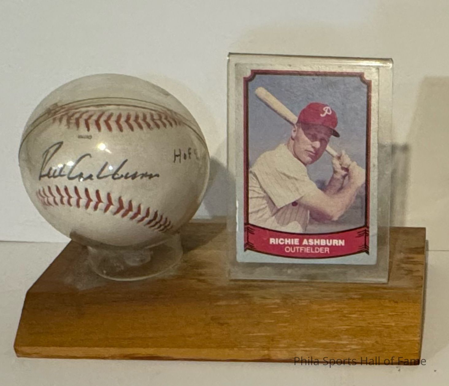 Richie Ashburn signed baseball. Richie Ashburn played center field for the Phillies from 1948-1959. He is one of the all-time greats in Phillies history. He was a member of the "Whiz Kids" who won the 1950 NL pennant. He made 4 all-star games while playing in Philadelphia and led the league in batting twice. His #1 is retired by the Phillies and he is a member of the Baseball Hall of Fame. After he retired he joined the Phillies broadcast team in 1963 where he served until he passed away in 1997. He was part of the inaugural induction class of the Philadelphia Sports Hall of Fame.Collection