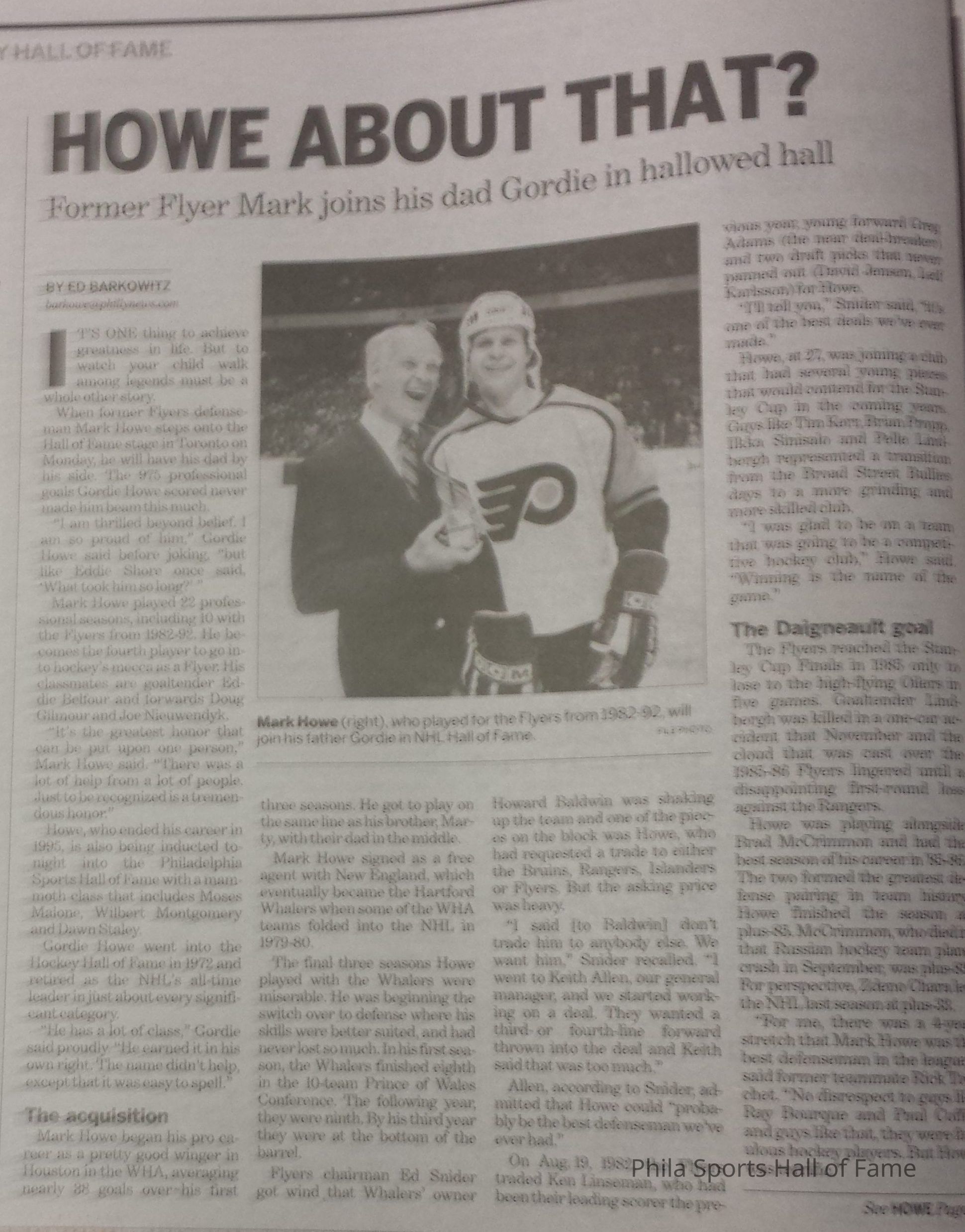Mark Howe Hockey Hall of Fame Article in Philly Daily News 11/12/11Context