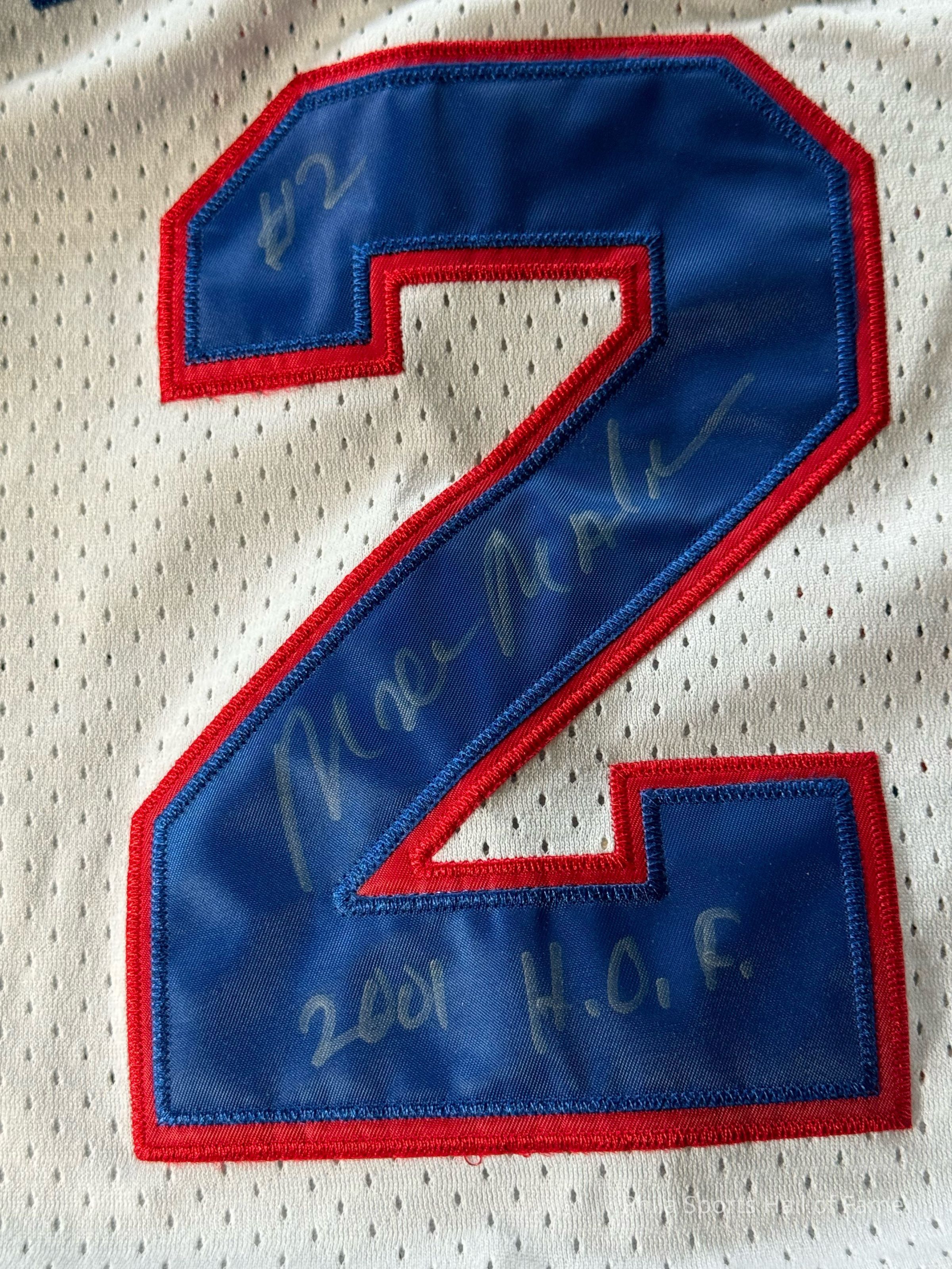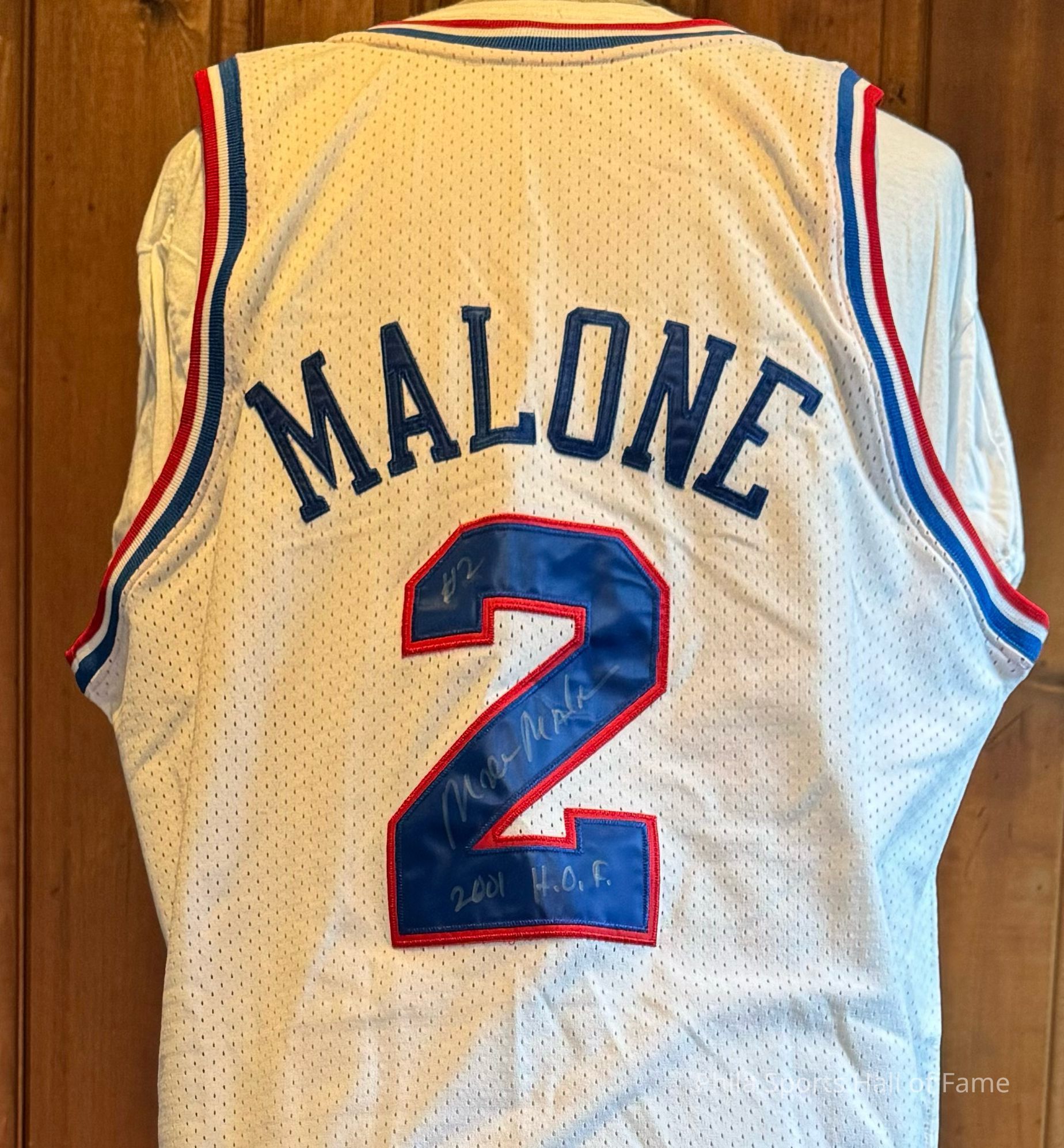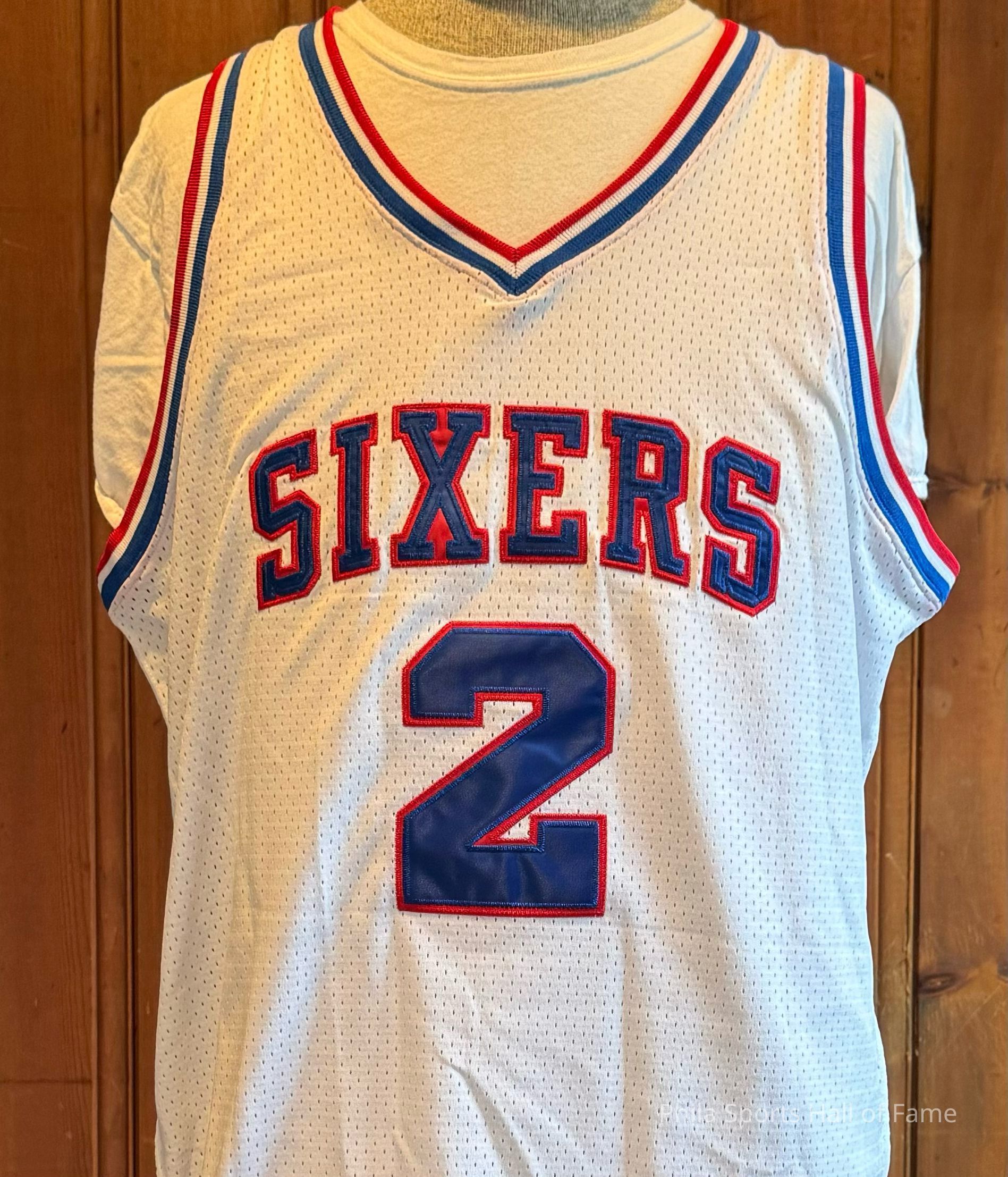 Moses Malone signed 76ers #2 jersey (authentic reproduction)Label/Inscription/Signature