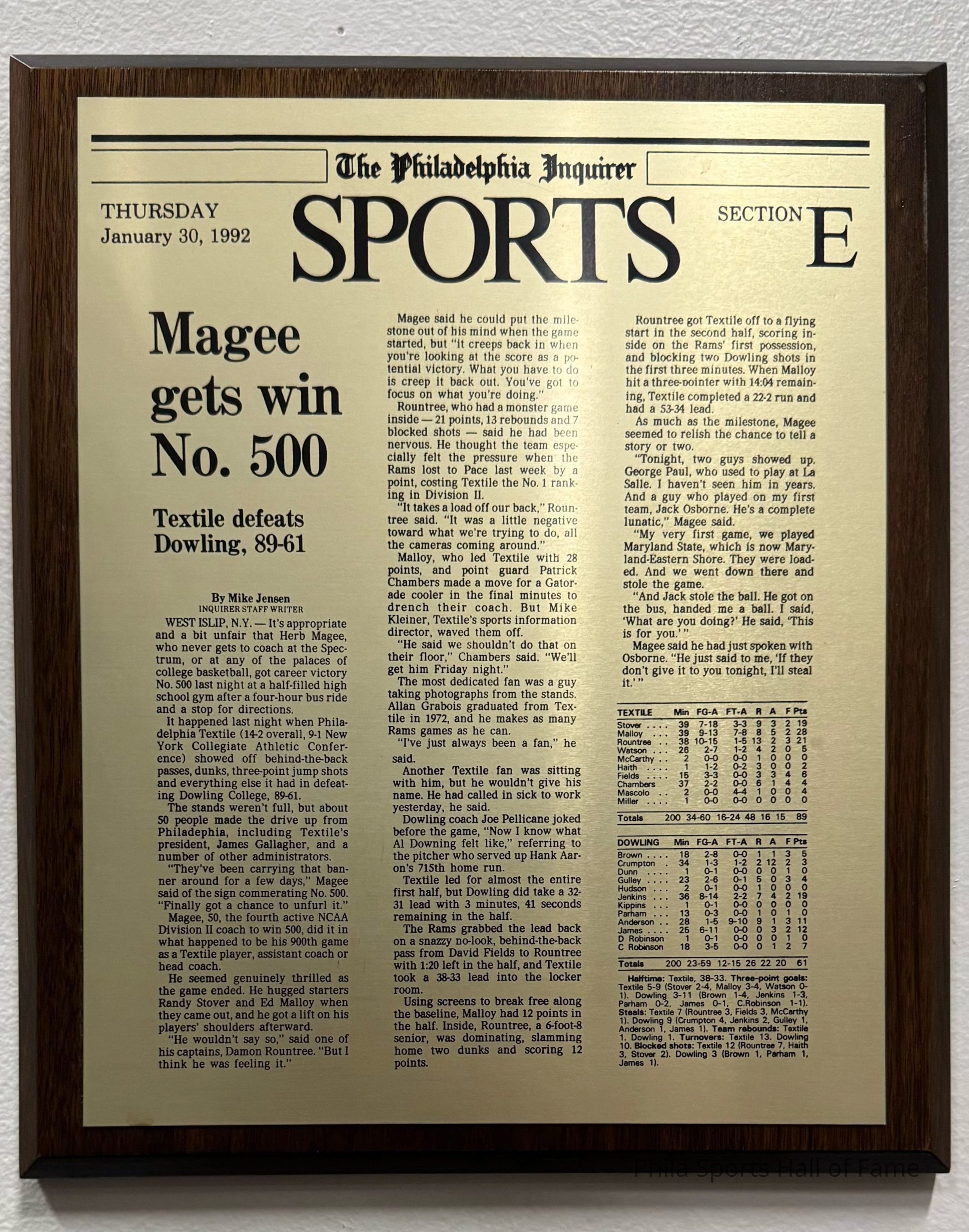 1992 Philadelphia Inquirer article on Herb Magee's 500th career win (Plaque)Publication Details