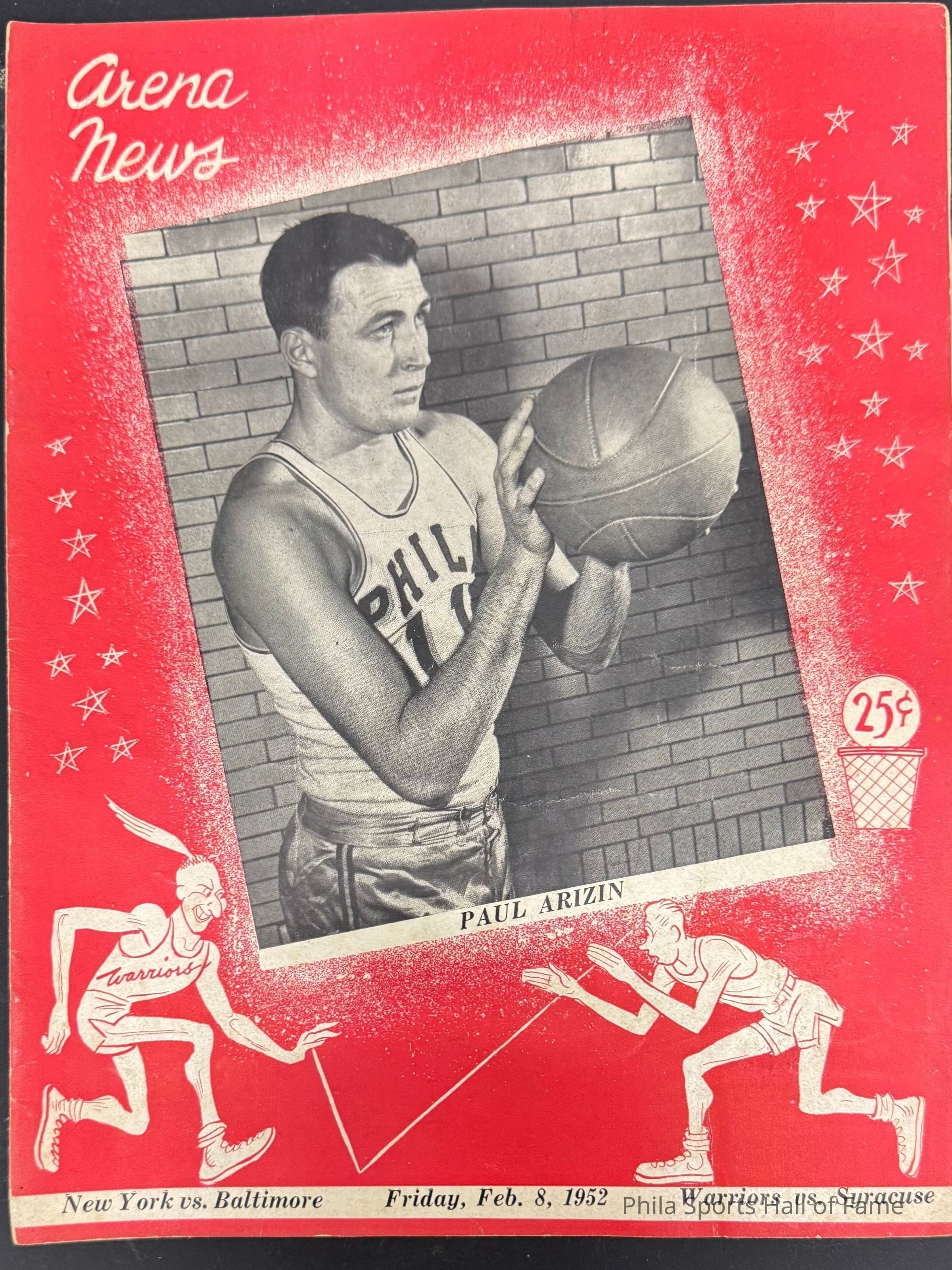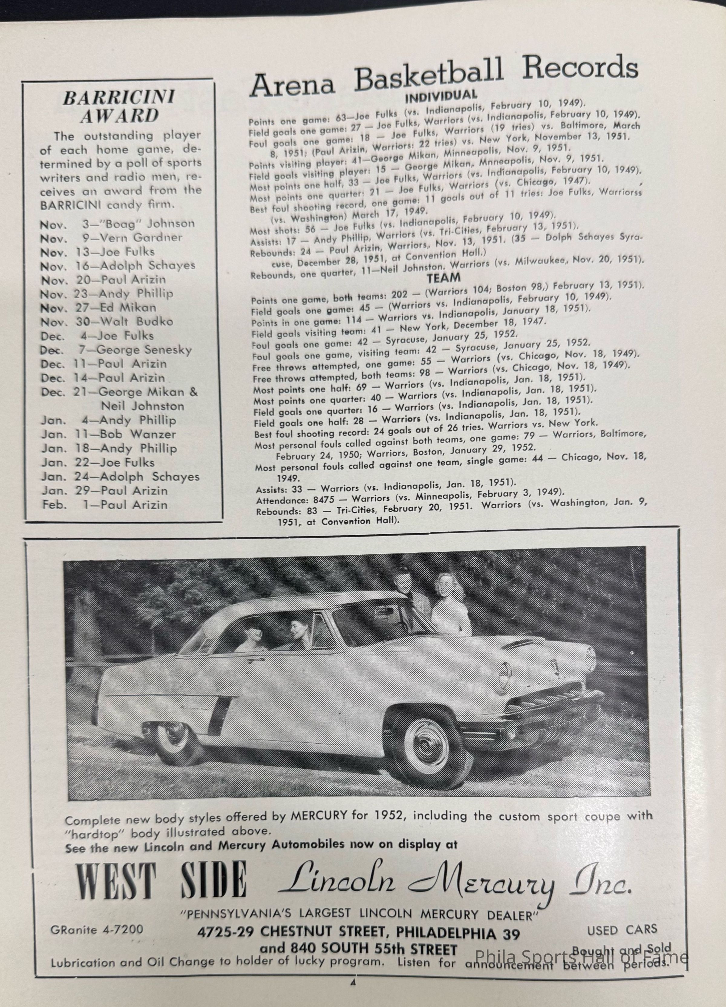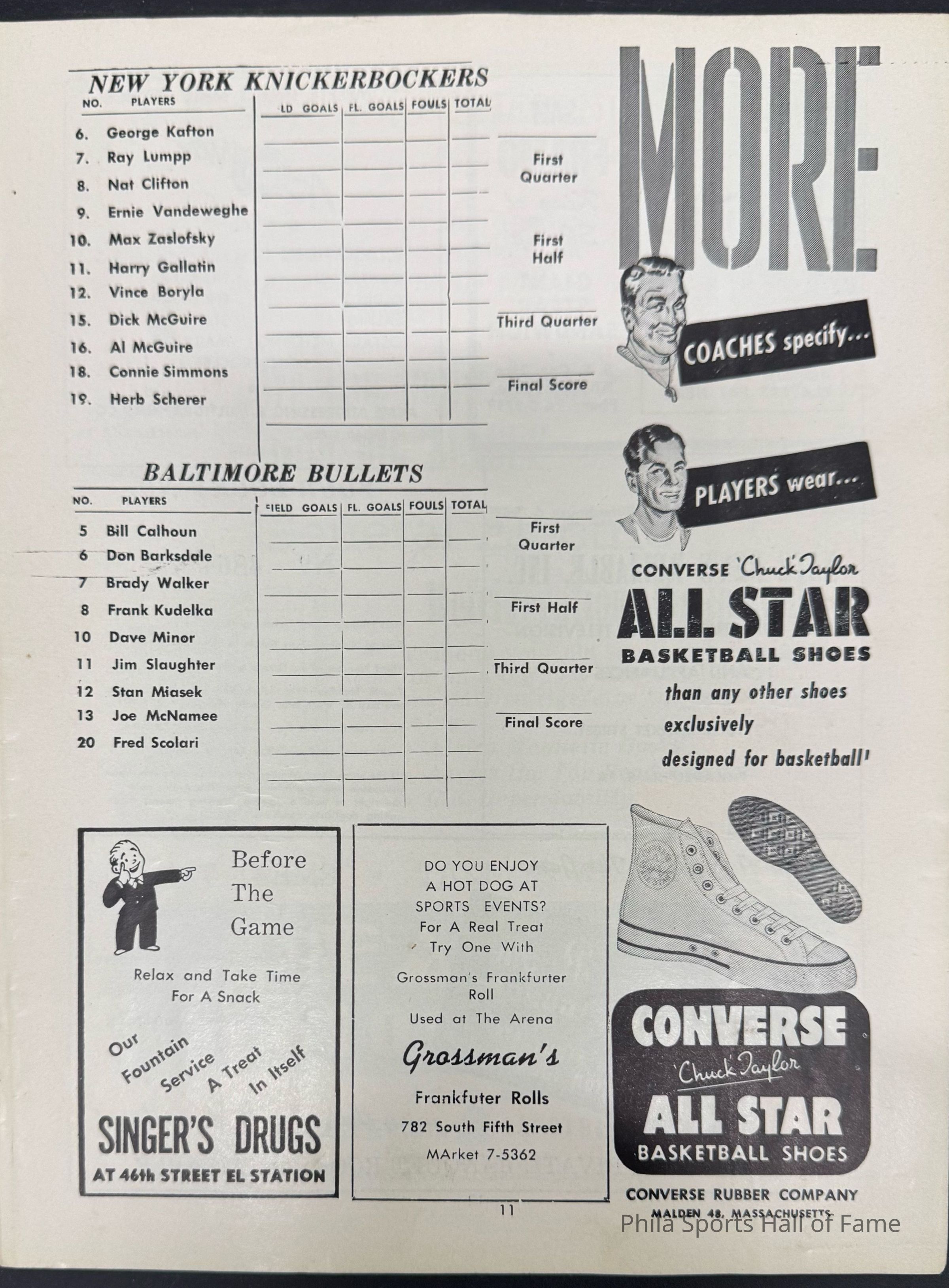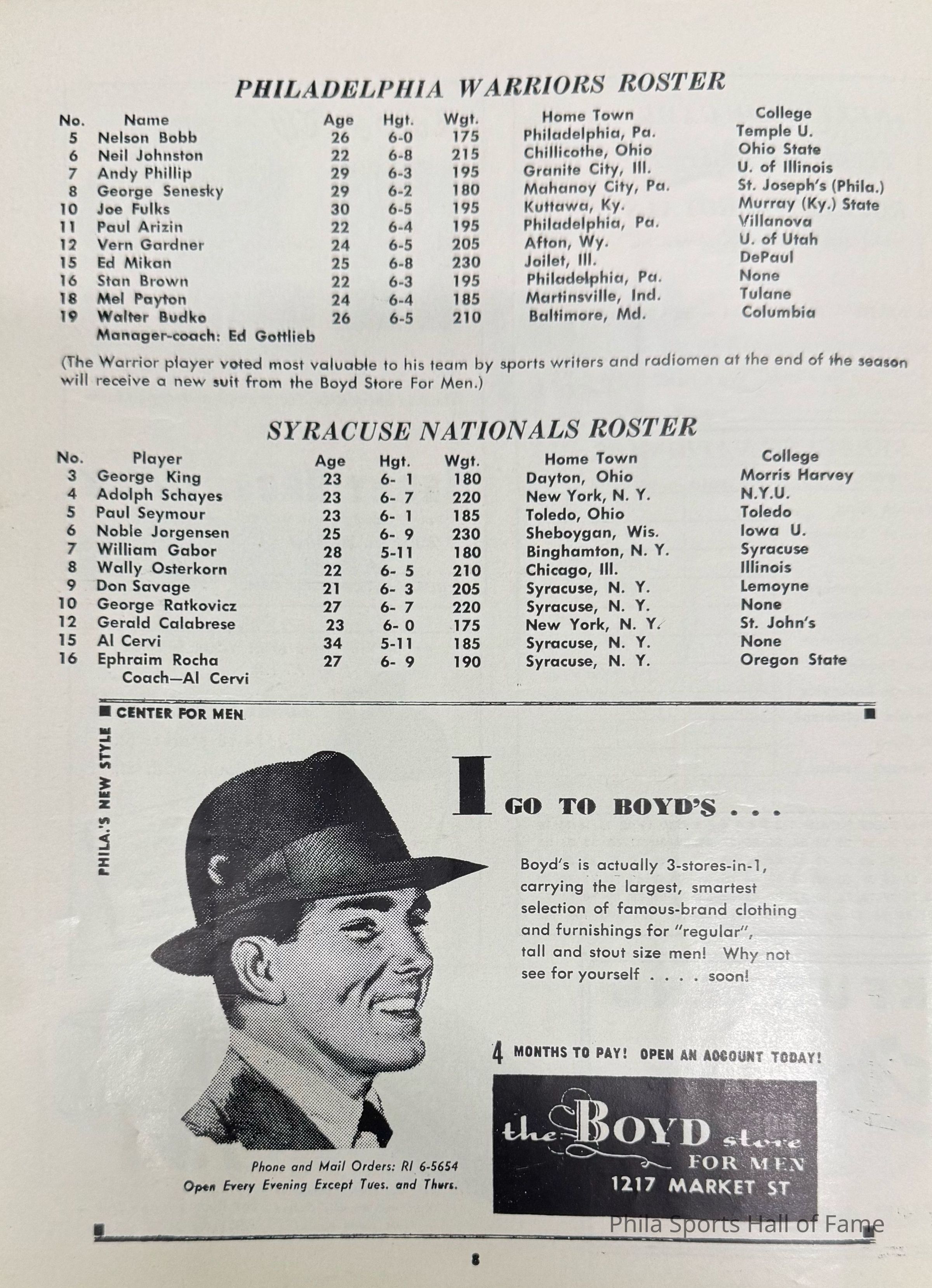 1952 Philadelphia Warriors vs Syracuse Nationals; Double-header with NY K nicks vs Baltimore BulletsDescription