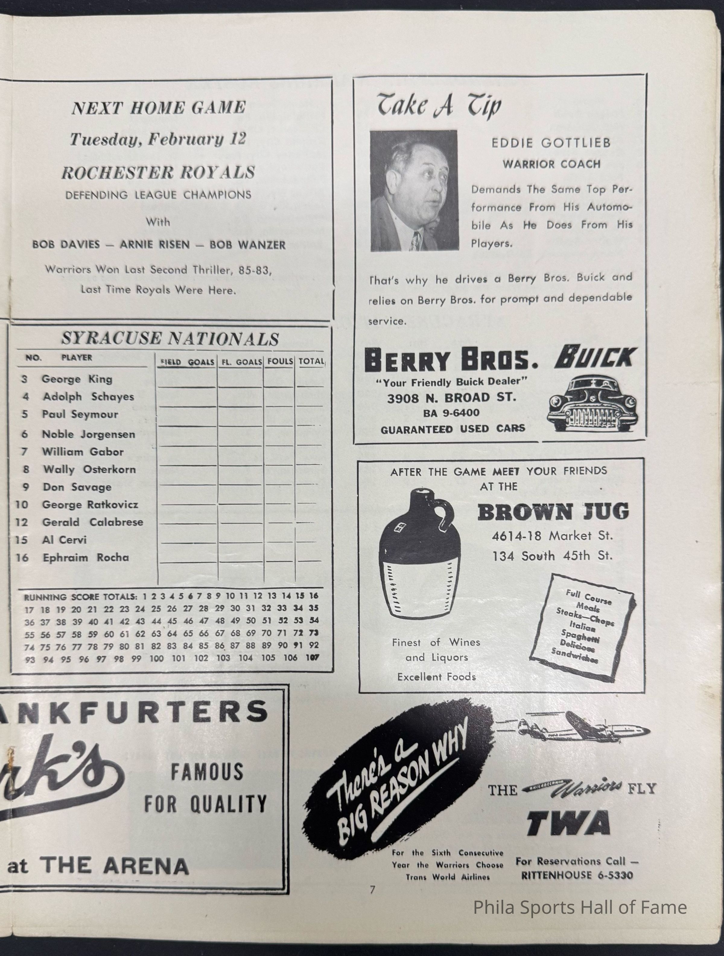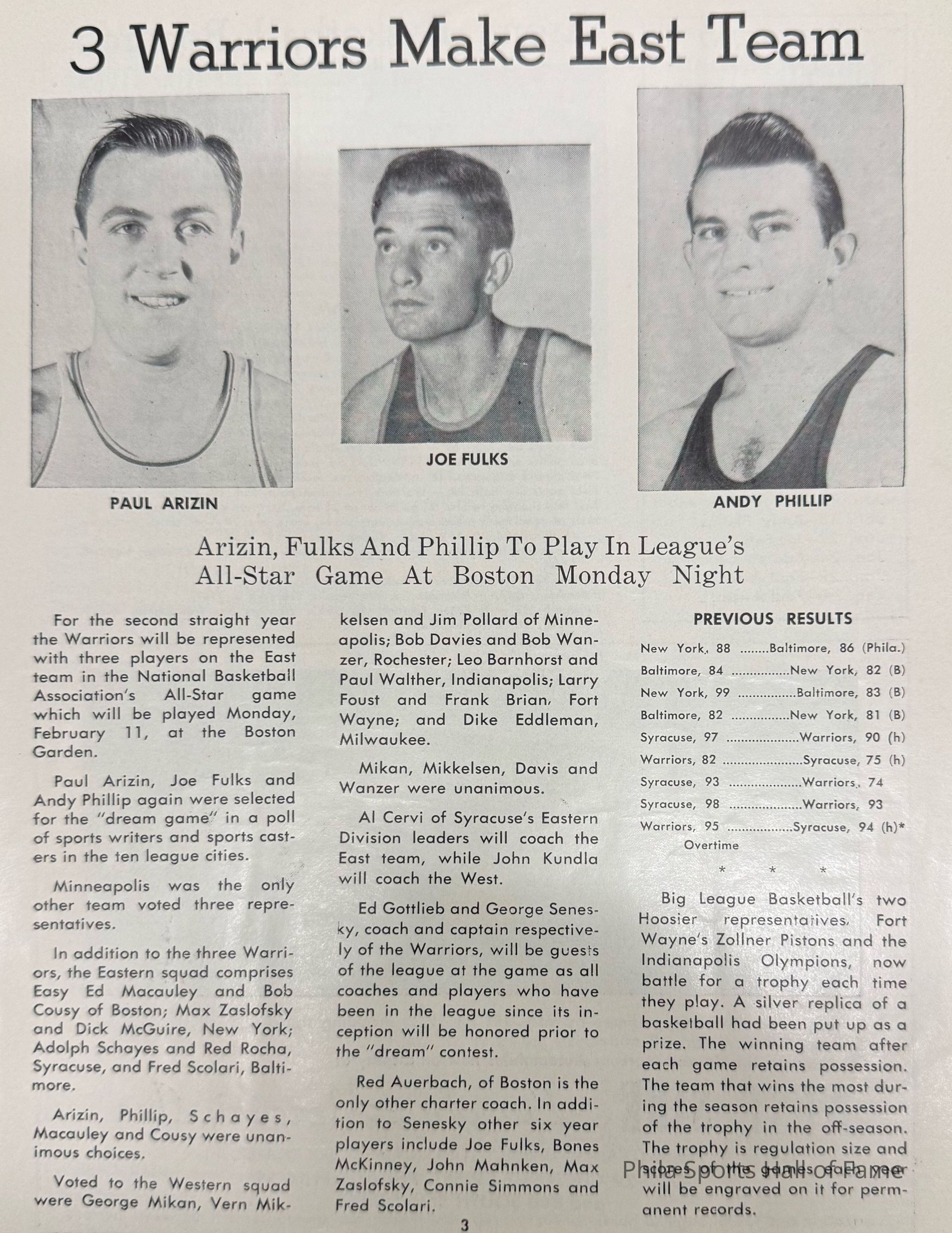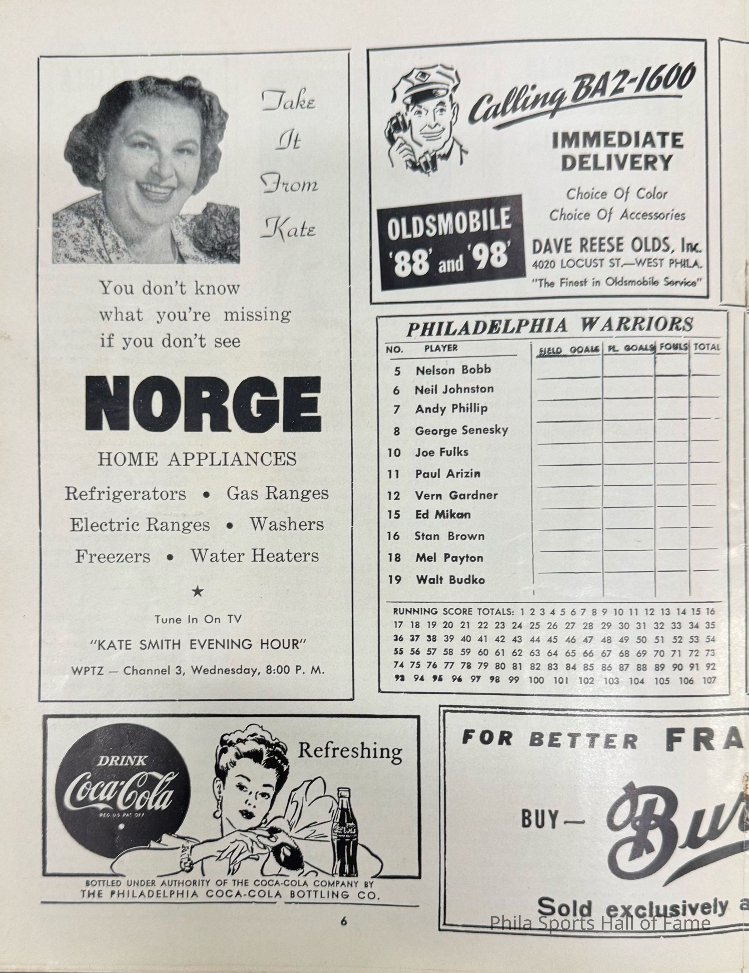 1952 Philadelphia Warriors vs Syracuse Nationals; Double-header with NY K nicks vs Baltimore BulletsDescription