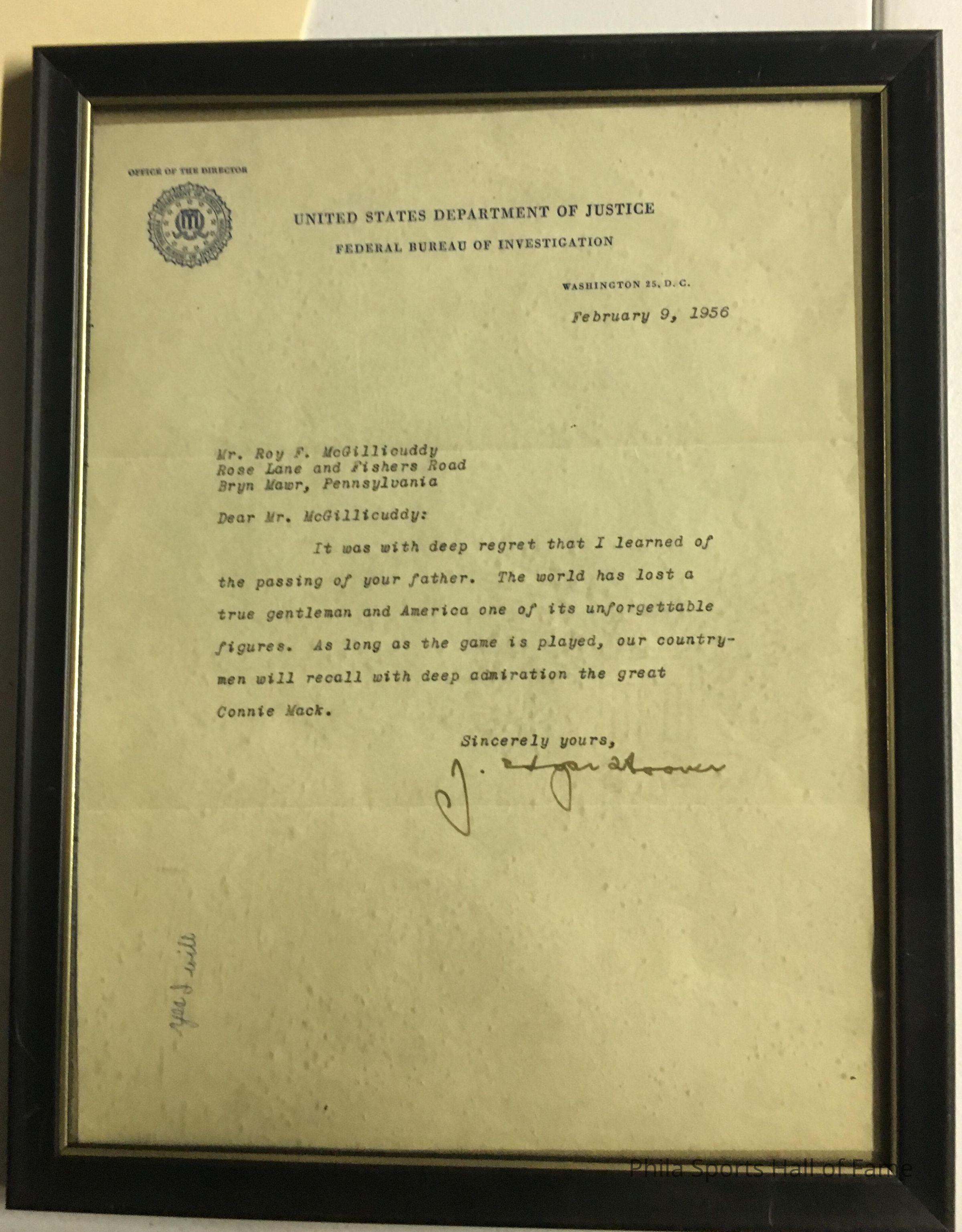 Letter from FBI Director J. Edgar Hoover on the passing of Connie Mack