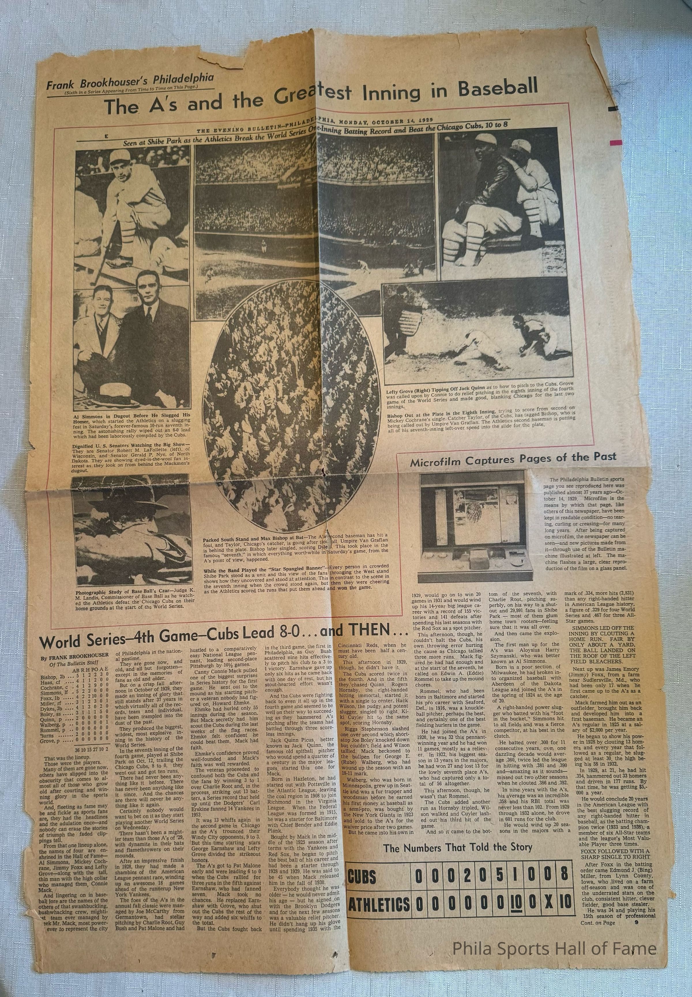 Philadelphia Bulletin (The Bulletin) clipping from Monday, October 14, 1929. The Philadelphia Bulletin was an evening newspaper published in Philadelphia until 1982. The article is about Game 4 of the 1929 World Series. Trailing 8-0 in the bottom of the 7th, the A's scored 10 runs and won the game 10-8 taking a 3 games to 1 lead. They would would win game 5 to win their first of back-to-back World Series.Other Names