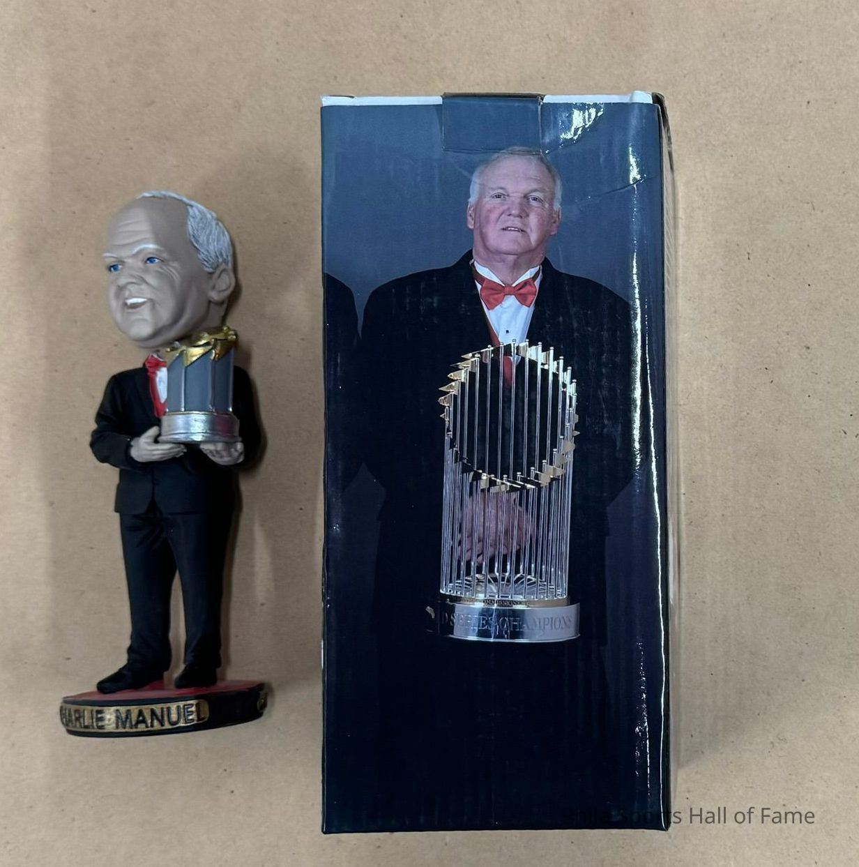 Charlie Manuel Bobblehead. Charlie is wearing a tuxedo holding the World Series Trophy from 2008. Manuel and numerous Phillies posed for the cover Phillies Magazine in 2009 with the trophy commemorating the teams 2008 championship. Manuel is the winningest manager in Phillies history and led them to 5 division titles, 2 NL pennants, and the 08 World Series. He was inducted into the Philadelphia Sports Hall of Fame in 2016.Other Names