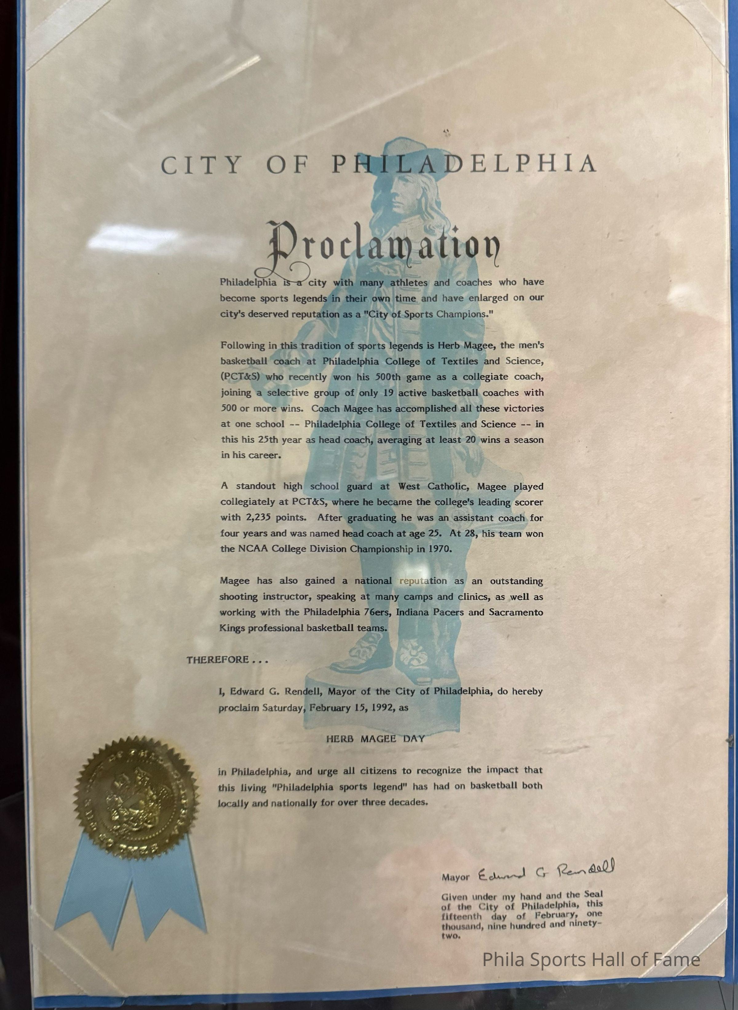 Proclamation declaring February 15, 1992 as "Herb Magee Day" in Philadelphia - signed by Ed RendellOther Names