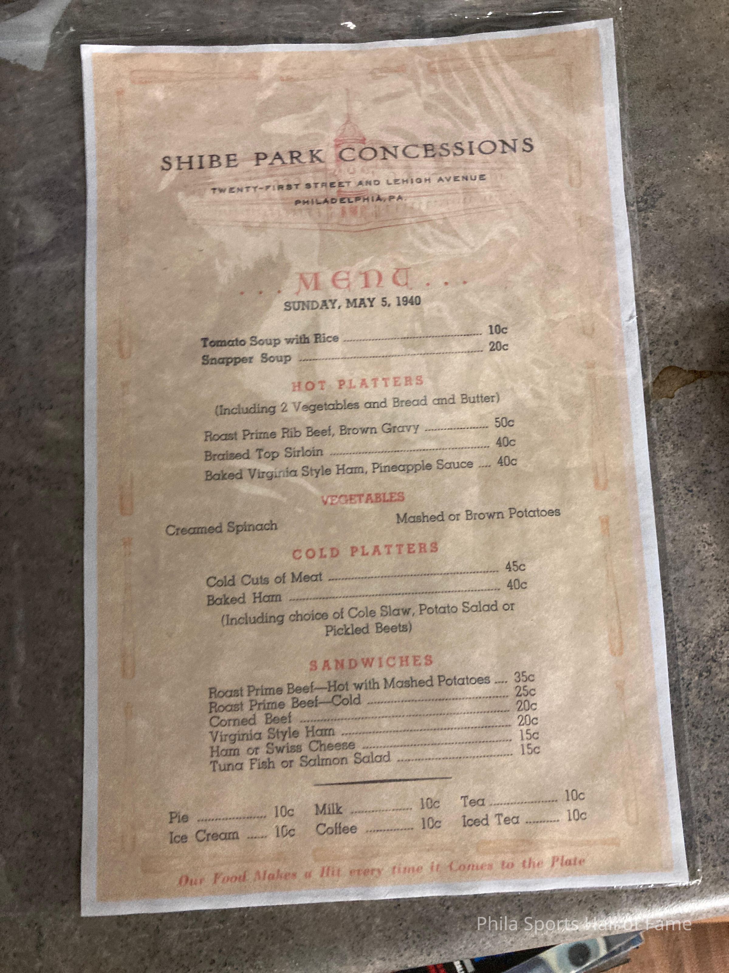 1940 Shibe Park concessions menu