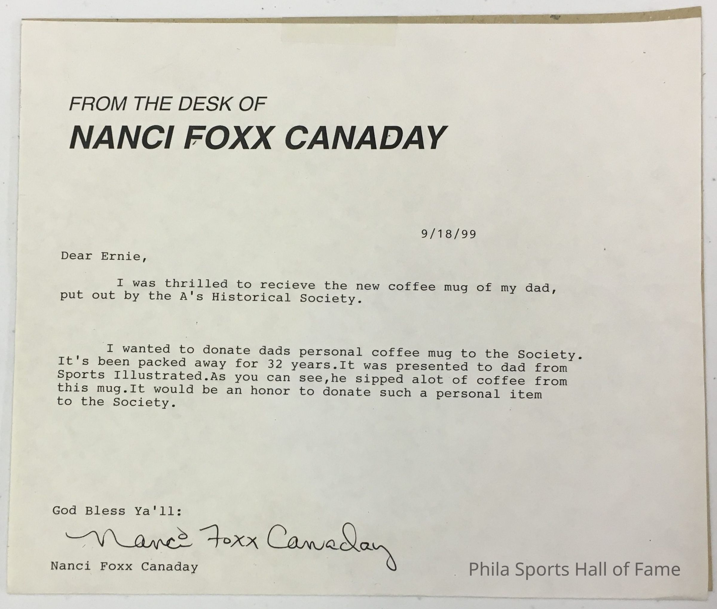 In 1999 the daughter of Jimmie Foxx, Nancy Canady Foxx, donated this mug to the Philadelphia Athletics Historical Society (PAHS). It remained the possession of the Society until 2015 when the society formally disbanded. At that time the PAHS continuance agreement went into effect which transferred ownership to the Philadelphia Sports Hall of Fame.