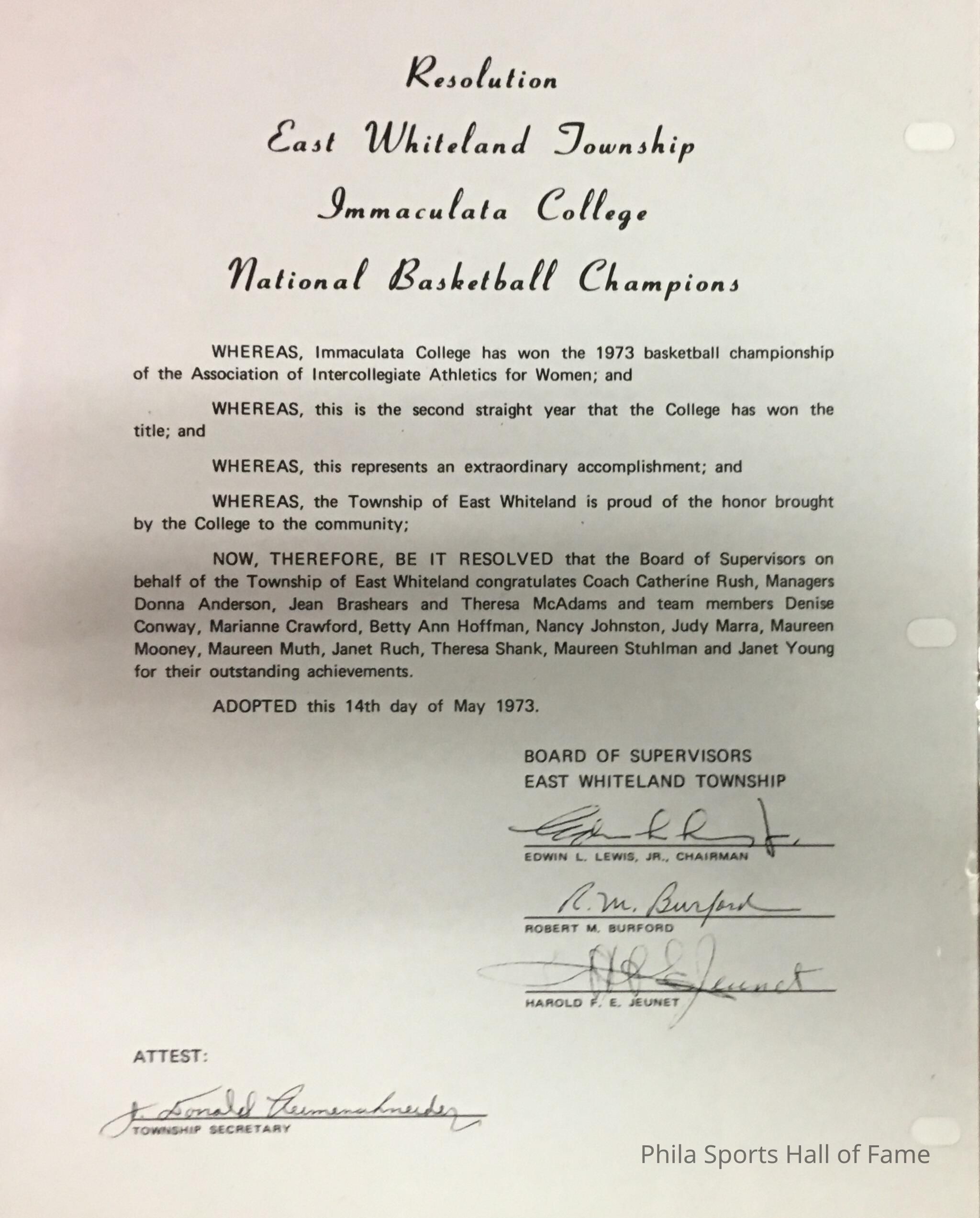 1973 Certificate from East Whiteland Twp Immaculata Mighty Macs National ChampionsCollection