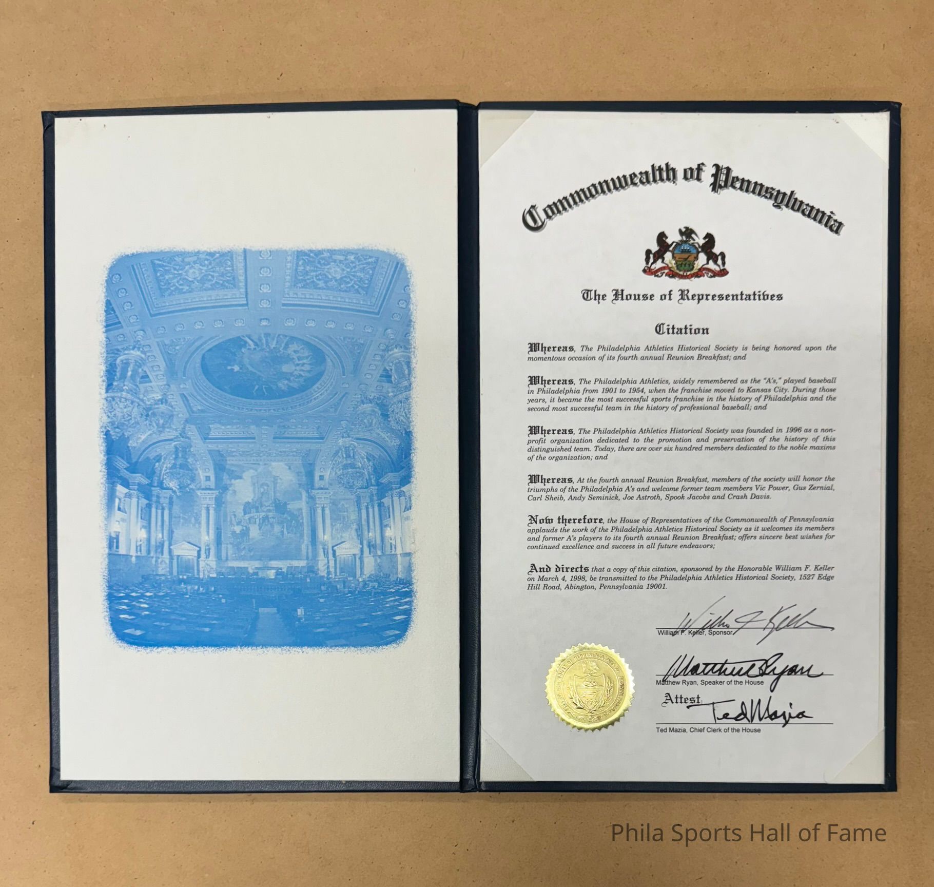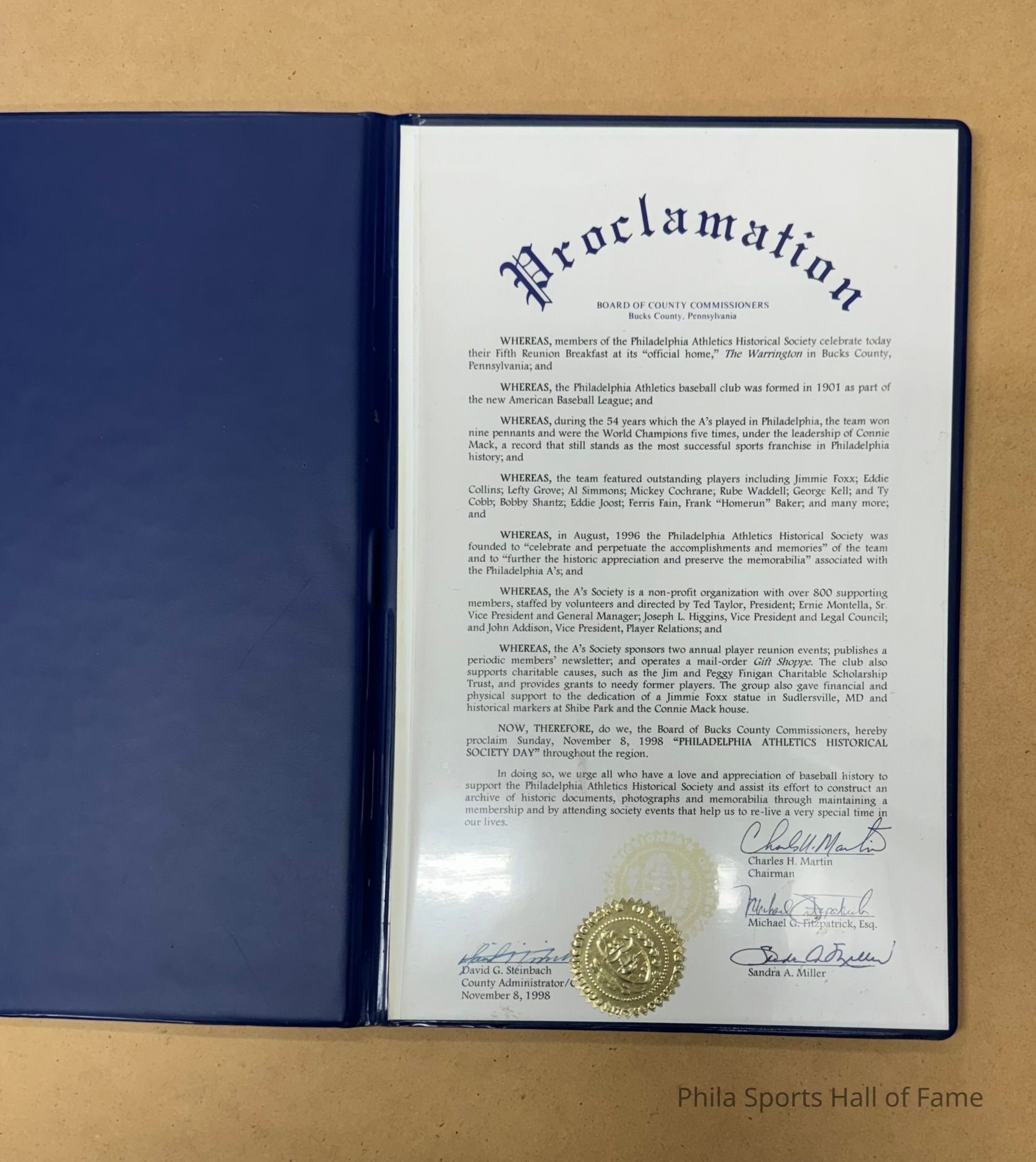 Philadelphia Athletics Historical Society - Official Proclamation - Bucks County, City of Philadelphia & State of Pennsylvania