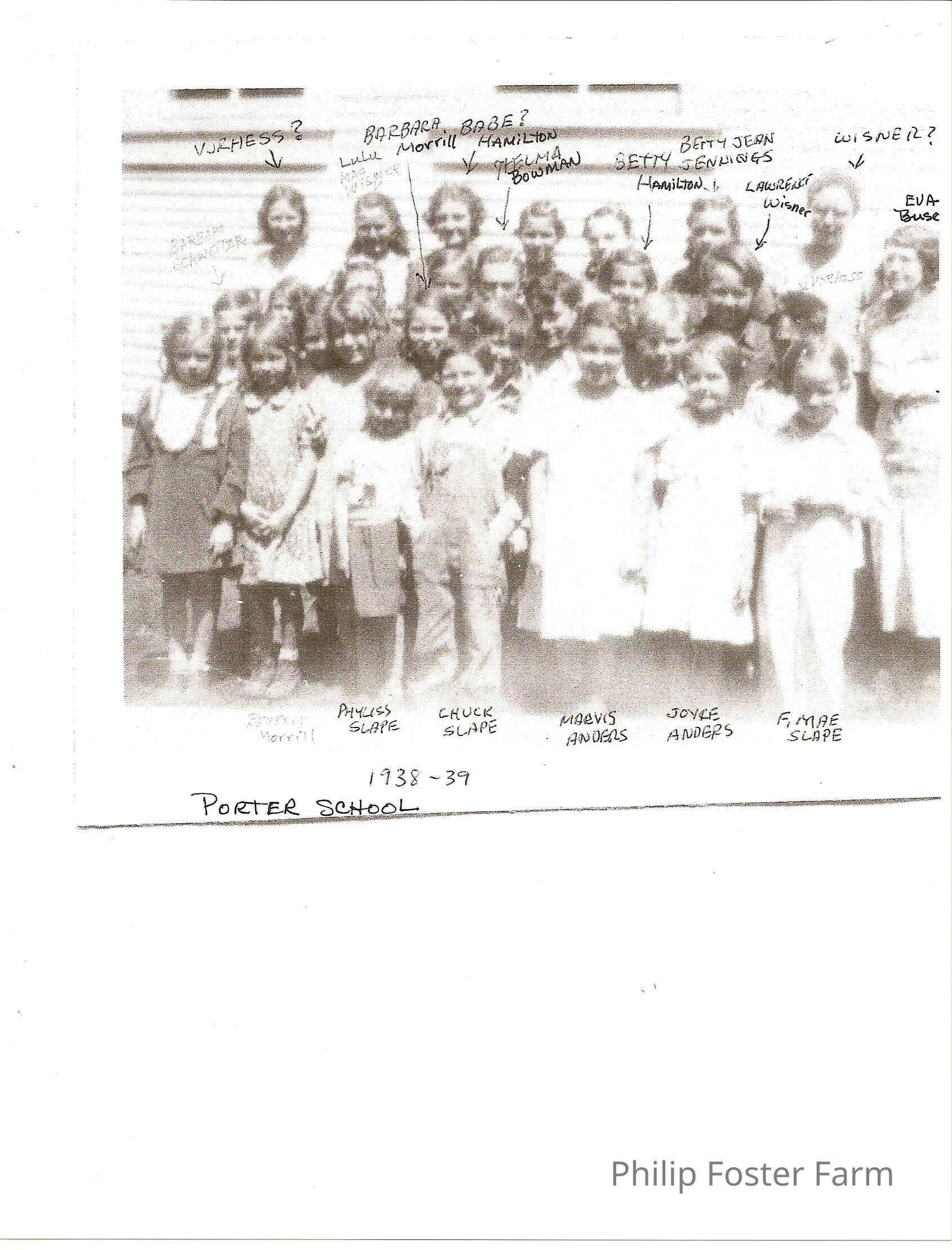 Scan of photograph of students standing in front of Porter School (1938-39). Photo labeled with names of students including, Thelma Bowman.