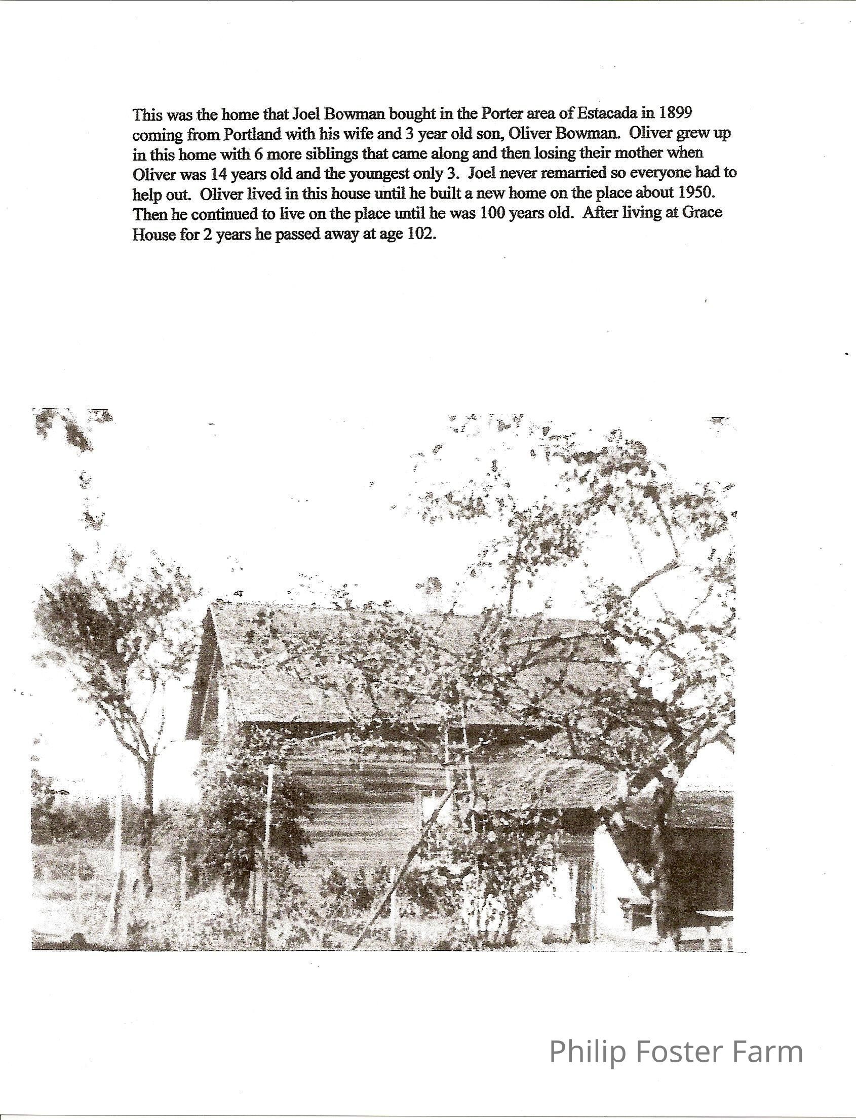 "This was the home that Joel Bowman bought in the Porter area of Estacada in 1899 coming from Portland with his wife and 3 year old son, Oliver Bowman. Oliver grew up in this home with 6 more siblings that came along and then losing their mother when Oliver was 14 years old and the youngest of 3. Joel never remarried so everyone had to help out. Oliver lived in this house until he built a new home on the place about 1950. Then he continued to live on the place until he was 100 years old. After living at Grace House for 2 years he passed away at age 102."Collection