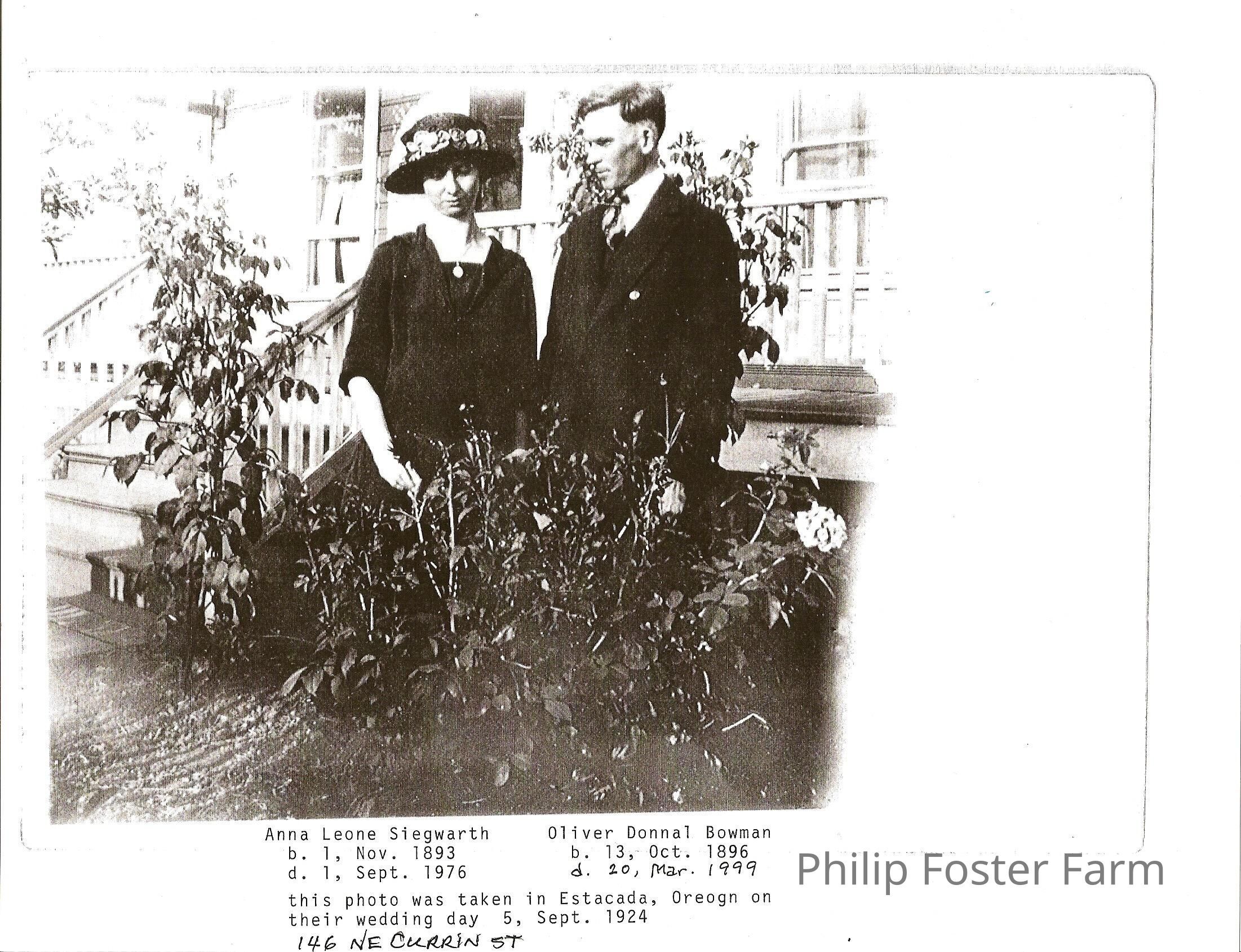 Scan of photograph of Anna Leone Sigwarth (1893-1976) and Oliver Donnal Bowman (1896-1999). "This photo was taken in Estacada, Oregon on their wedding day 5, Sept. 1924."