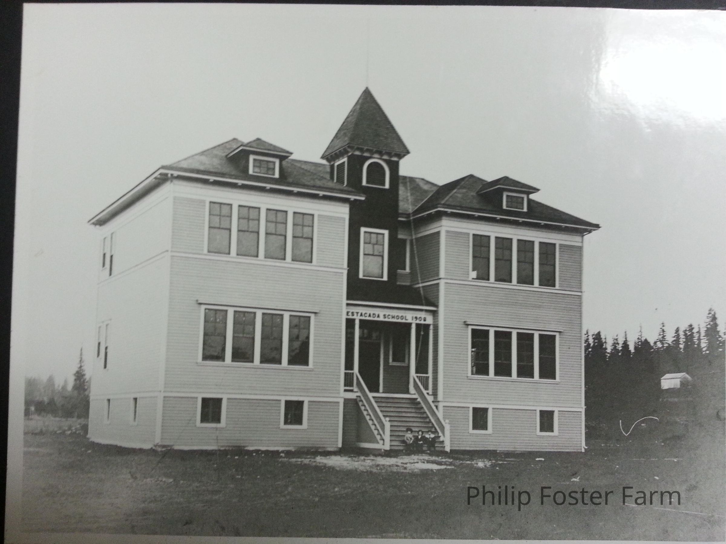 Estacada Grade School 1906. Front view of school with 3 kids sitting on front steps.