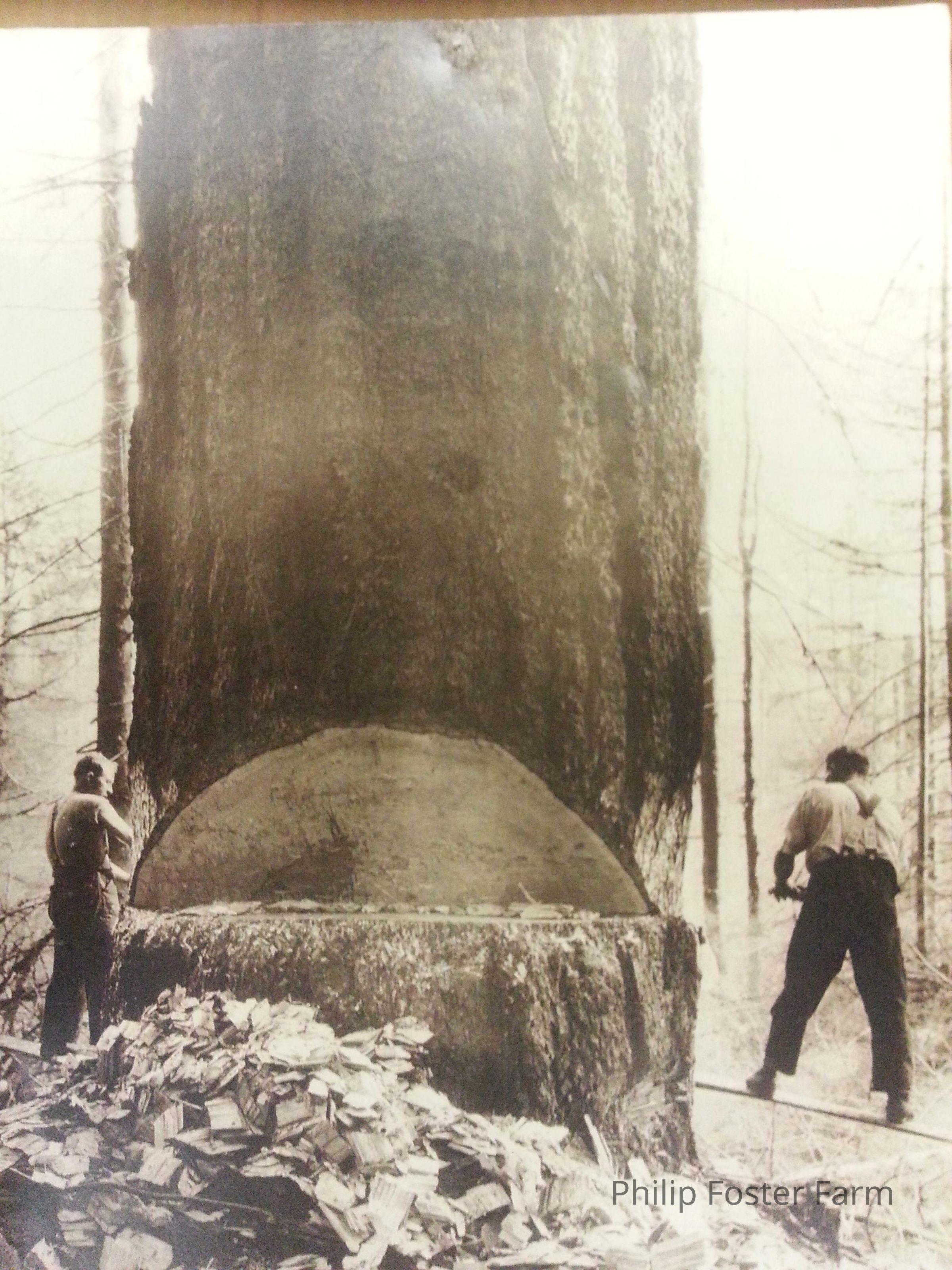 2 loggers in process of cutting down giant tree. Photo has some nicks, dents, and scratches.