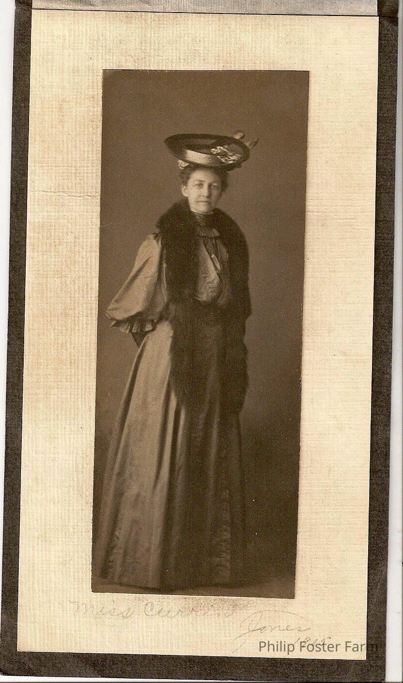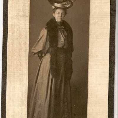 Picture of Lady in Dress with fur scarf around neck and turned up hat. Discription says: miss Currin Jones 1905.