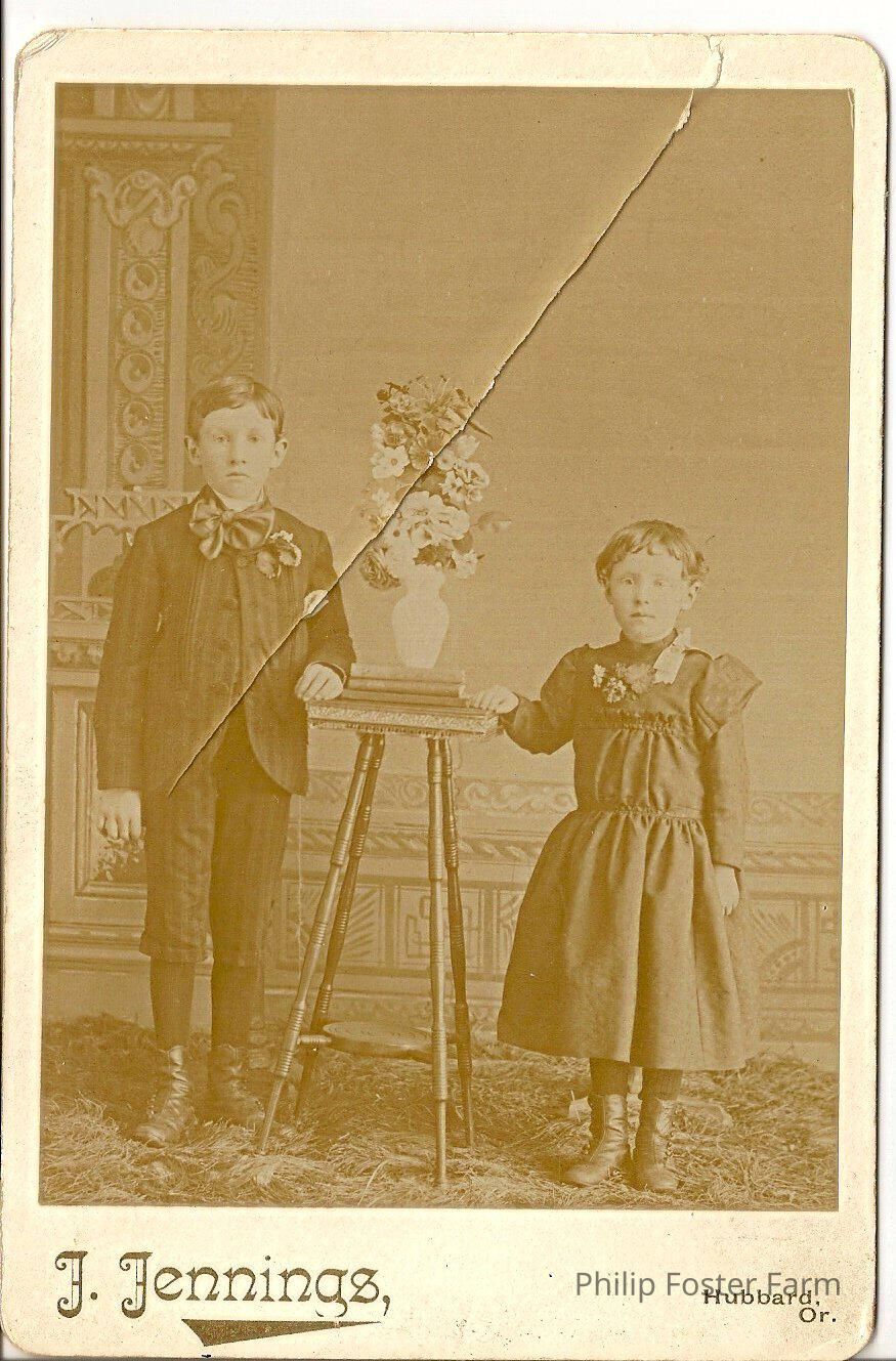 Photo of two bored looking children. (could have just been the time period) Standing on either side of a small table with books and a flower pot on it. (flowers included) Boy wearing a suit with bow tie. Back says: from George Lewellen. Mrs Lewellen - pose of Will + Jenice CurrinCollection