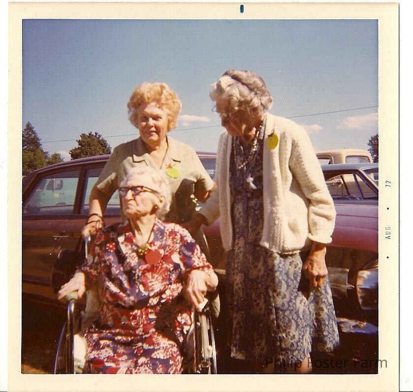 Photo of three women next to a car. One woman with short red hair pushing a wheel chair. Woman in wheel chair with short white hair, glasses and a red and blue dress. Third woman standing next to them, short white hair, glasses, wearing a white sweater and blue dress. Writing on back of photo: Currin Wade -1972.Collection