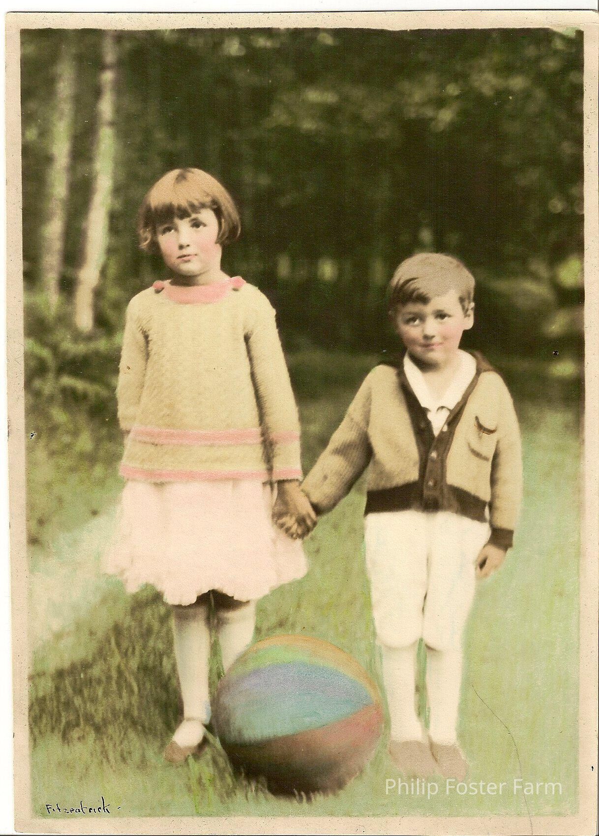2 Children, Boy and girl, Holding hands outside. A multi colored ball in forground. Girl is wearing a yellow and pink sweater with a pink dress. Boy is wearing a yellow and brown sweater jacket with white shorts. At bottom left of picture the name Fitzpatrick is written.Collection