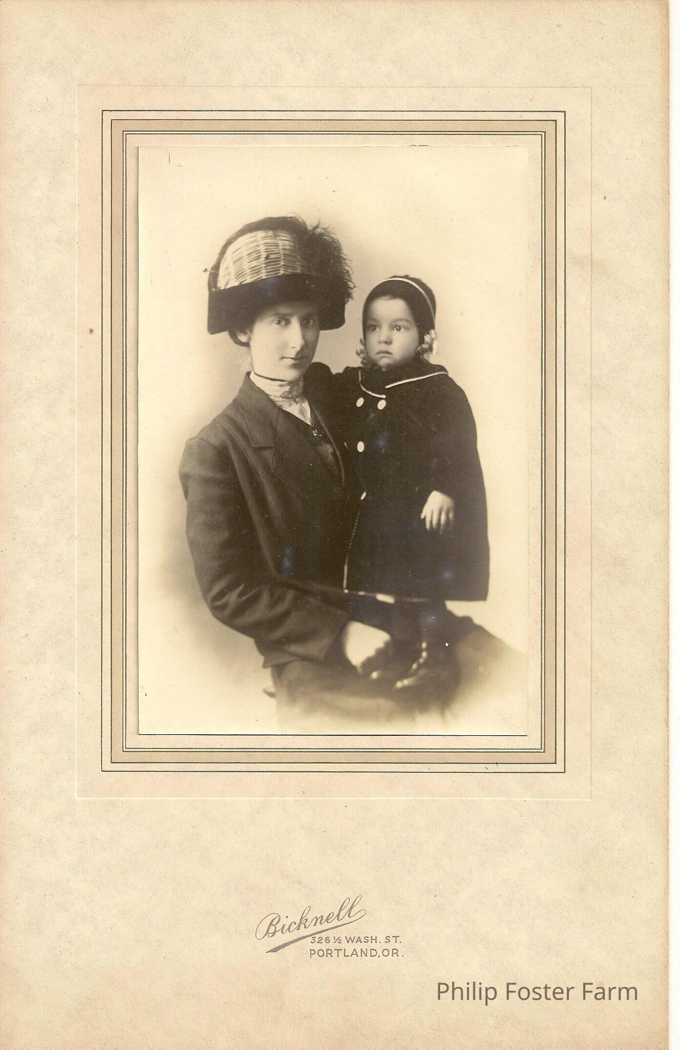 Woman sitting down wearing a black dress and coat with black and white heat with feather. Child almost standing on womans lap. Child is wearing all black, coat shoes and hat. Picture is inside folded very thick tan paper. Below the picture is the logo for Bicknell with the address: 326 1/2 Wash. St. Portland, OR.Collection