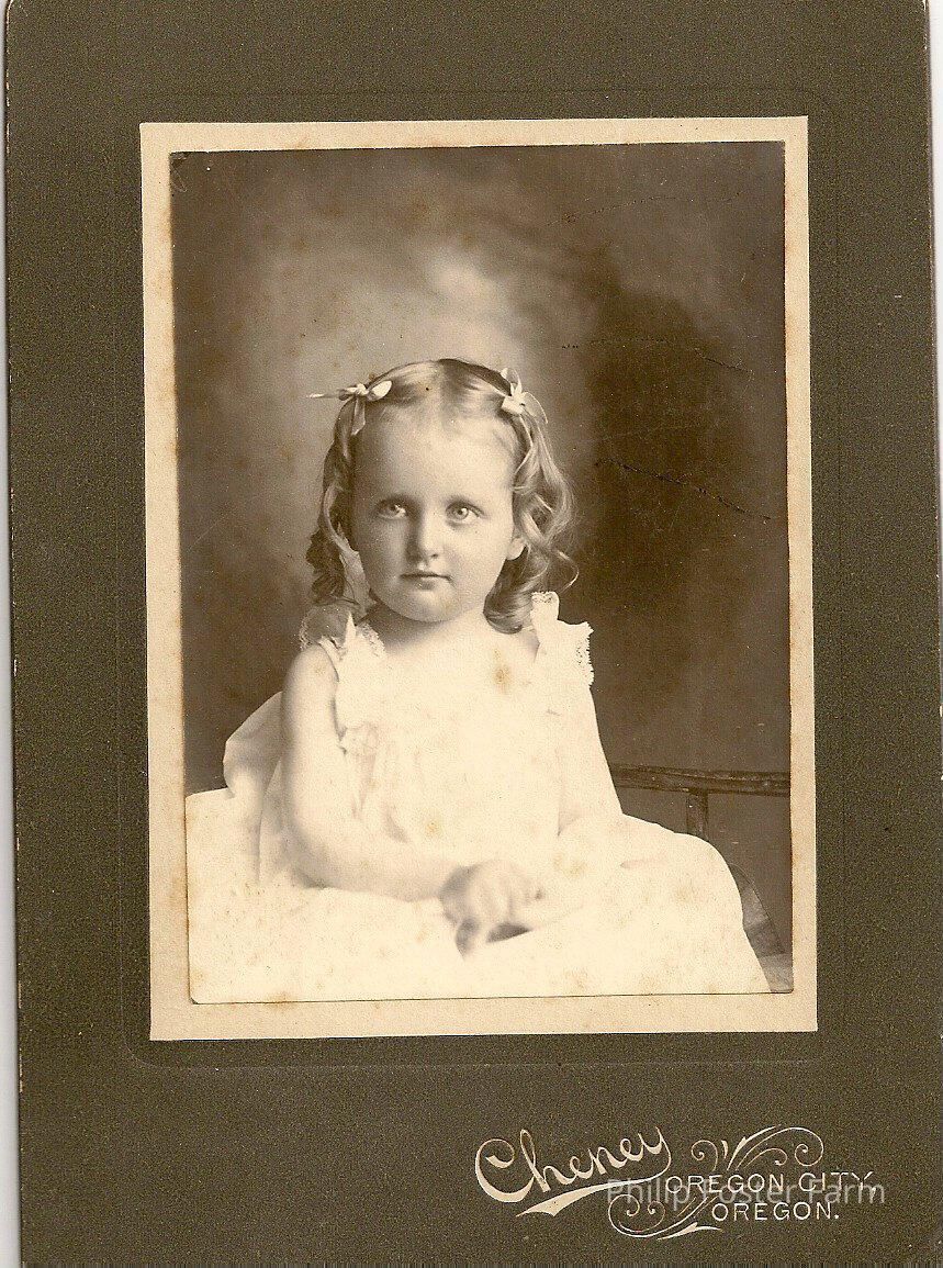 Young girl sitting down in a white dress. Below photo is logo for Cheney Oregon City, Oregon. On back of picture is written: Dora Currin. This item is linked to 2 others of same subject.Collection