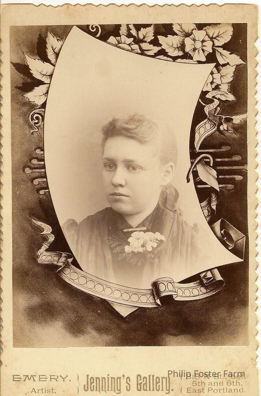 Woman wearing black with a white flower. Framed by a scroll with flowers and ribbins around. On the back can be seen a faded picture of a man in a suit. Edges have gold colering and have been cut in a pattern. below picture is printed: Emery, Artist. Jenning's Gallery. 318 N ST., bet. 5th and 6th, East Portland.Collection