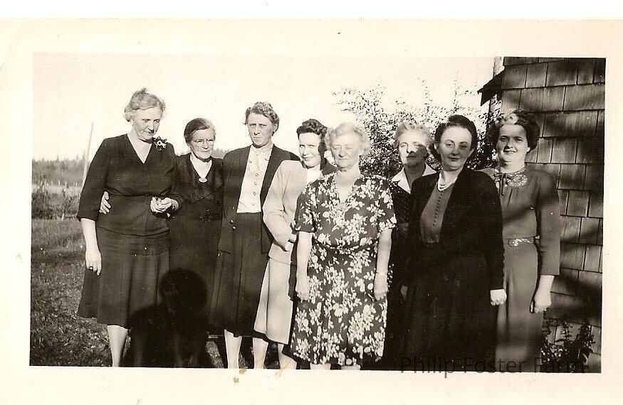 8 woman lining up for photo. Building in the back to the right. There are names written on the back of the photo: Mural, Della, Flo, Hazel, Nell, Mary. (The other 2 names are not understandable) Also written on back is: at Dellas Dec 13-1945Collection