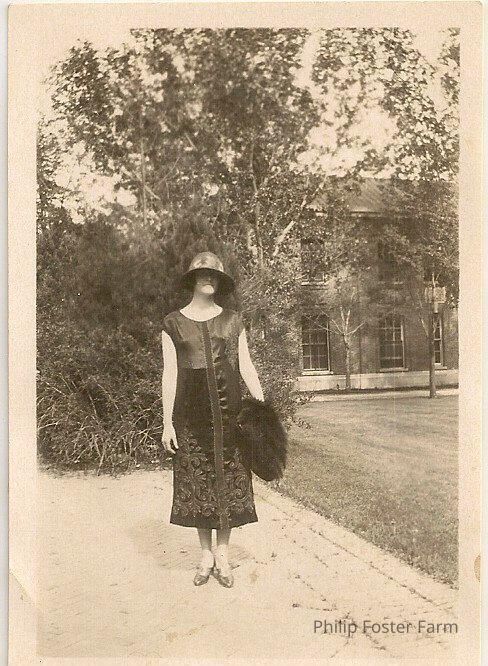 Woman outdoors wearing a black dress and hat. the dress has a pattern near the bottom. in the background is a house. On the back of the photo is a short letter.