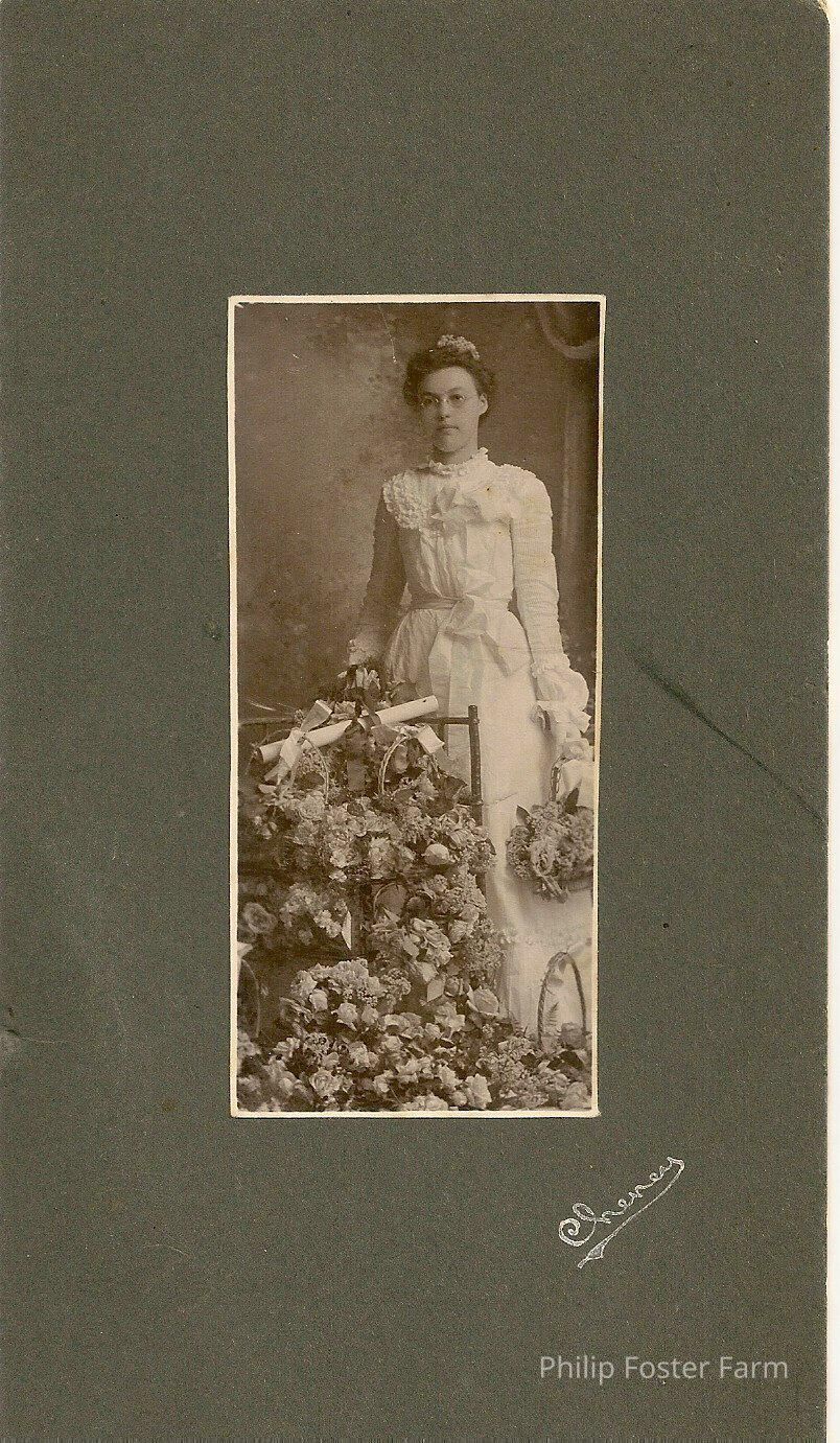 Woman In white dress wearing glasses and holding flowers, Standing next to a stand of flowers. Below the picture is the logo: Cheney. on the back is the name Nora Hale.Collection