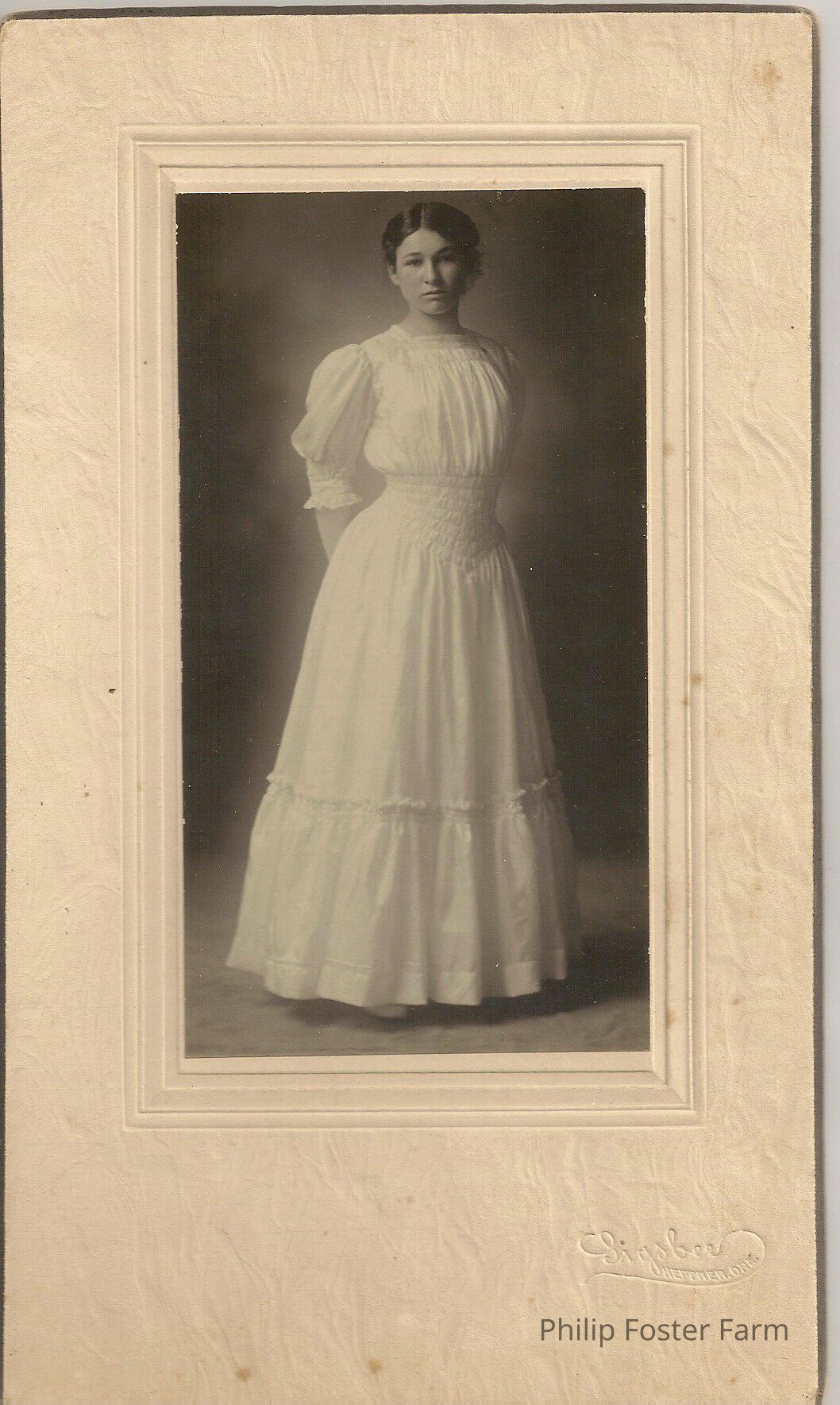 Woman wearing white posed for picture. heavy paper around picture has impressions in a square with a pattern around that. on the back is written: Nettie Currin