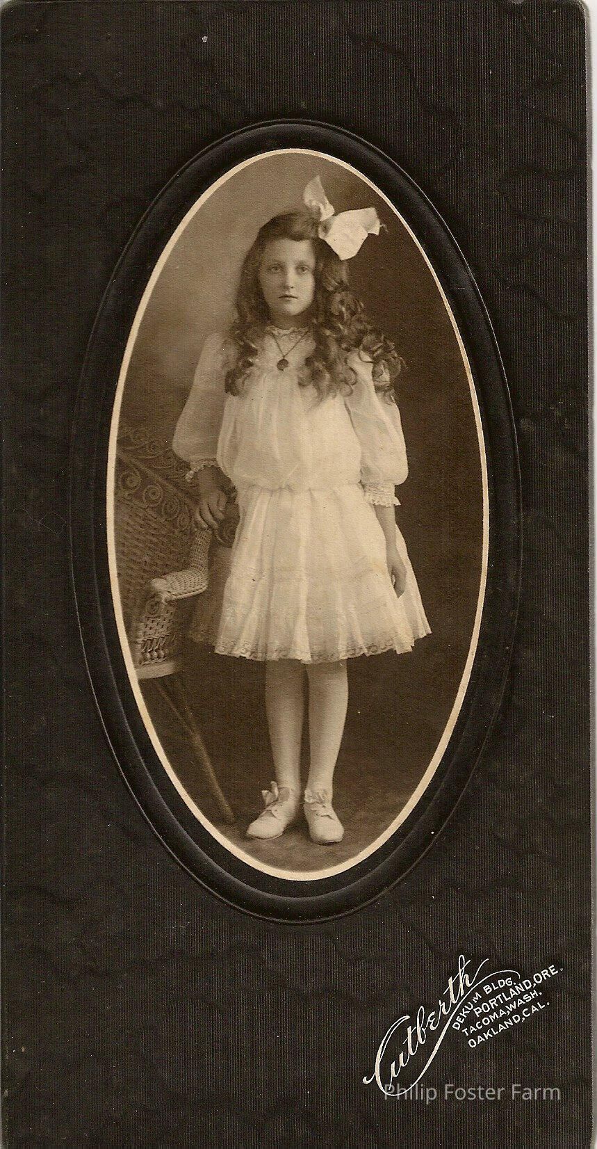 Girl leaning against a wicker chair. Wearing a white dress, white shoes with a white bow in her hair. On the back is written: 8 years old Dora Currin