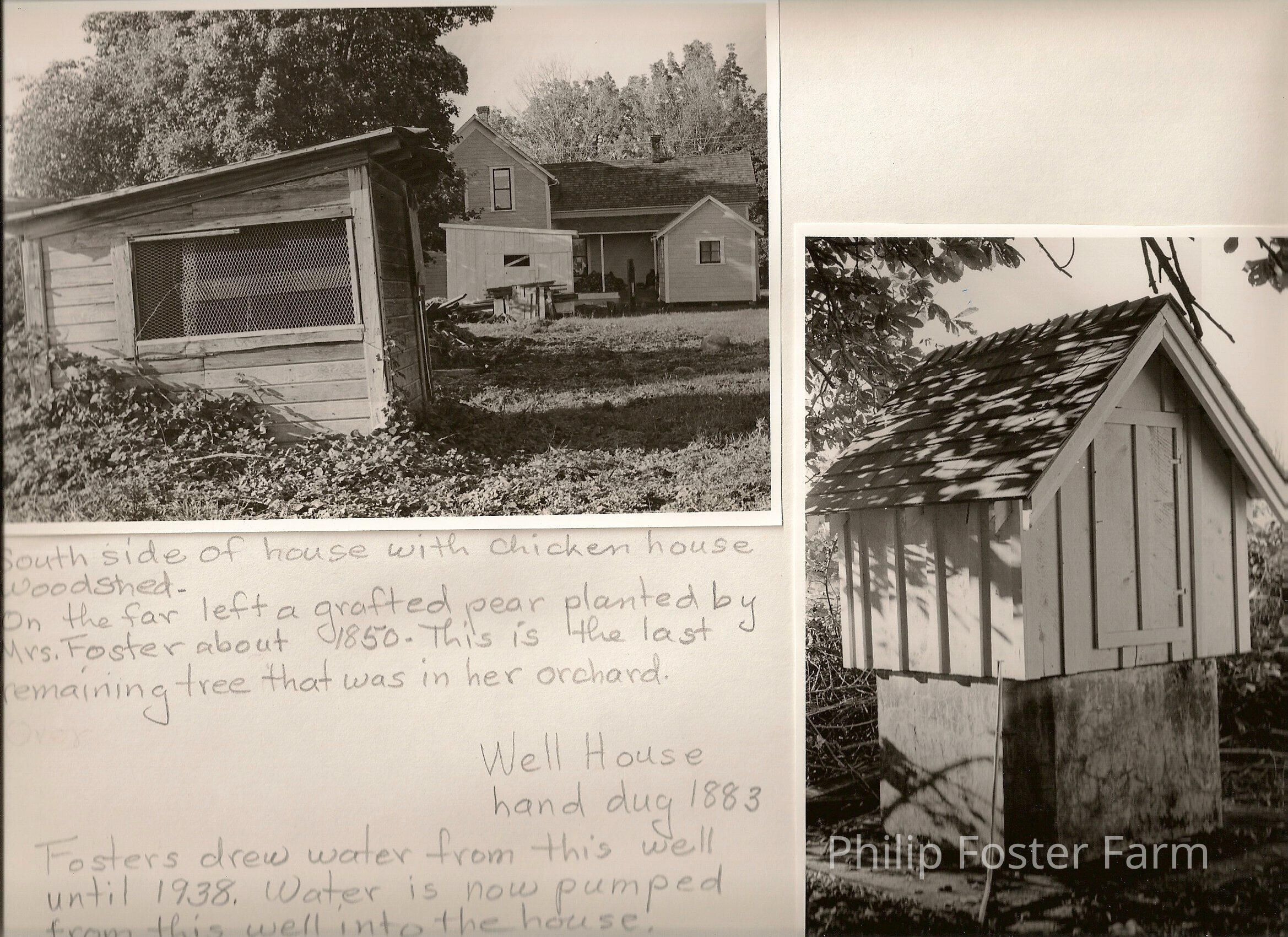 2 pictures of Foster farm. Captions for photos. 1: South side of house with chicken house woodshed. On the far left a grafted pear planted by Mrs. Foster about 1850. This is the last remaining tree that was in her orchard. 2: Well house hand dug 1883. Fosters drew water from this well until 1938. Water is now pumped from this well into the house. according to Wm. Williams, Clifton Glover, Roy Meyers.Collection