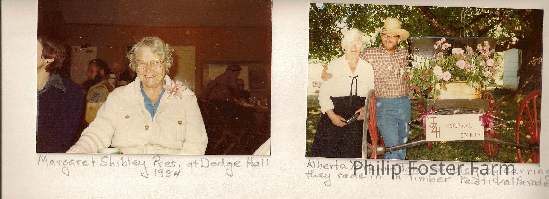 2 photos. first is labled: Mararet Shibley Pres. at Dodge Hall 1984. Second is labled: Alberta York and John Shibley by carriage they rode in in (sic) Timber Festival Parade 1985Collection