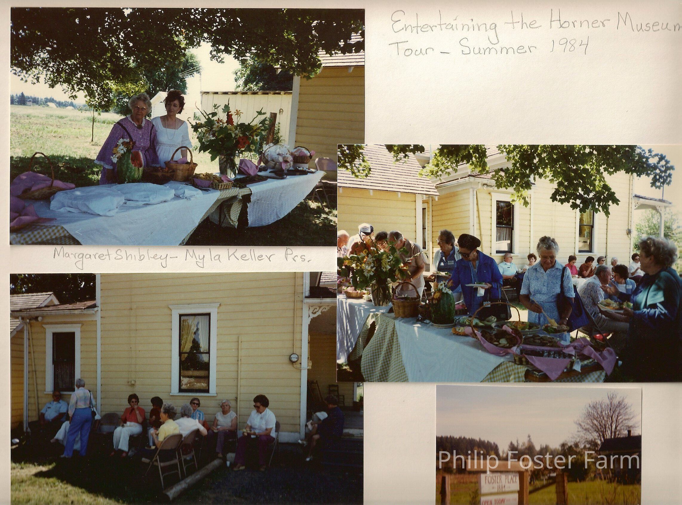 4 pictures. Written at the top is: Entertaining the Horner Museum Tour - Summer 1984. First picture is of two woman in front of table with flowers and covered food on it. caption states: Margaret Shibley - Myla Keller Prs. Second picture has a group of people sitting next to yellow house with food. Third picture has group of people getting food from buffet. Other people are eating in background. Picture four is of a sign saying: Fosters Place 1884, Open today 12:00 - 5:00Collection