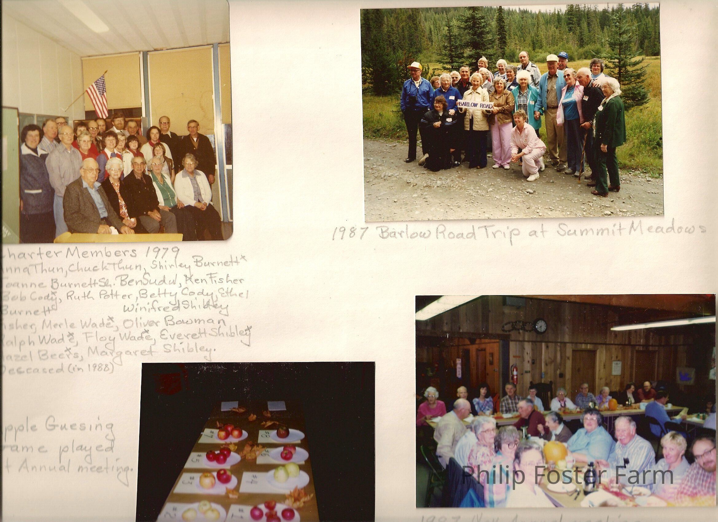 4 pictures showing the members and activitys of the Jacknife-Zion-Horseheaven Historical Society. First picture is of a group of peole. caption: Charter Members 1979. Anna Thun, Chuck Thun, Shirley Burnett(x), Joanne Burnett Sh., Ben Sudul, Ken Fisher, Bob Cody(x), Ruth Potter, Betty Cody, Ethel (seperate) Burnett(), (space) Winifred Shibley, Fisher, Merle Wade(x), Oliver Bowman, Ralph Wade(x), Floy Wade(x), Everett Shibley(x), Hazel Beers(x), Margaret Shibley. x Deceased (in 1988. Second picture has groups of apples placed on plates with numbers next to them. Caption: Apple Guesing Game played at Annual meeting. Third picture is of a group of people outdoors. Forest in the background with one of the people holding a sign saying: Barlow Road. Caption: 1987 Barlow Road Trip at Summit Meadows. Fourth picture is of 24 peole eating at tables in a large room. Caption: 1987 Nov. Annual meeting.Collection