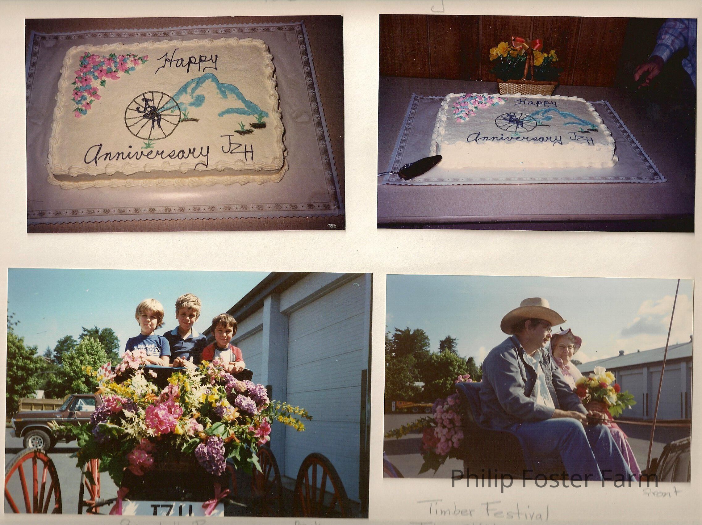 4. Man and woman on buggy with flowers in back. Man is wearing white shirt, blue pants, a jacket and a straw hat. Woman is wearing a pink dress and bonnet and is holding flowers. caption: Timber Festival. John Shibley, Margaret Shibley