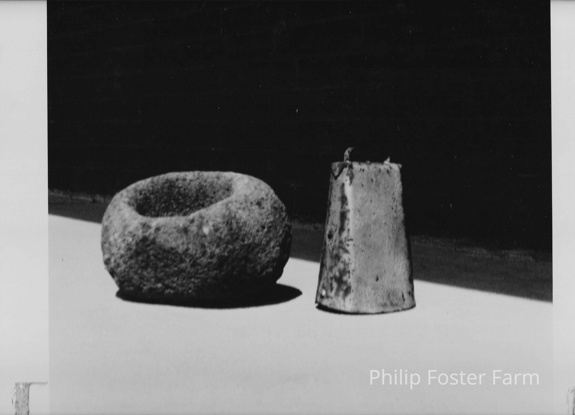 Mortar plowed up by Hank Suter and First school bell 1850