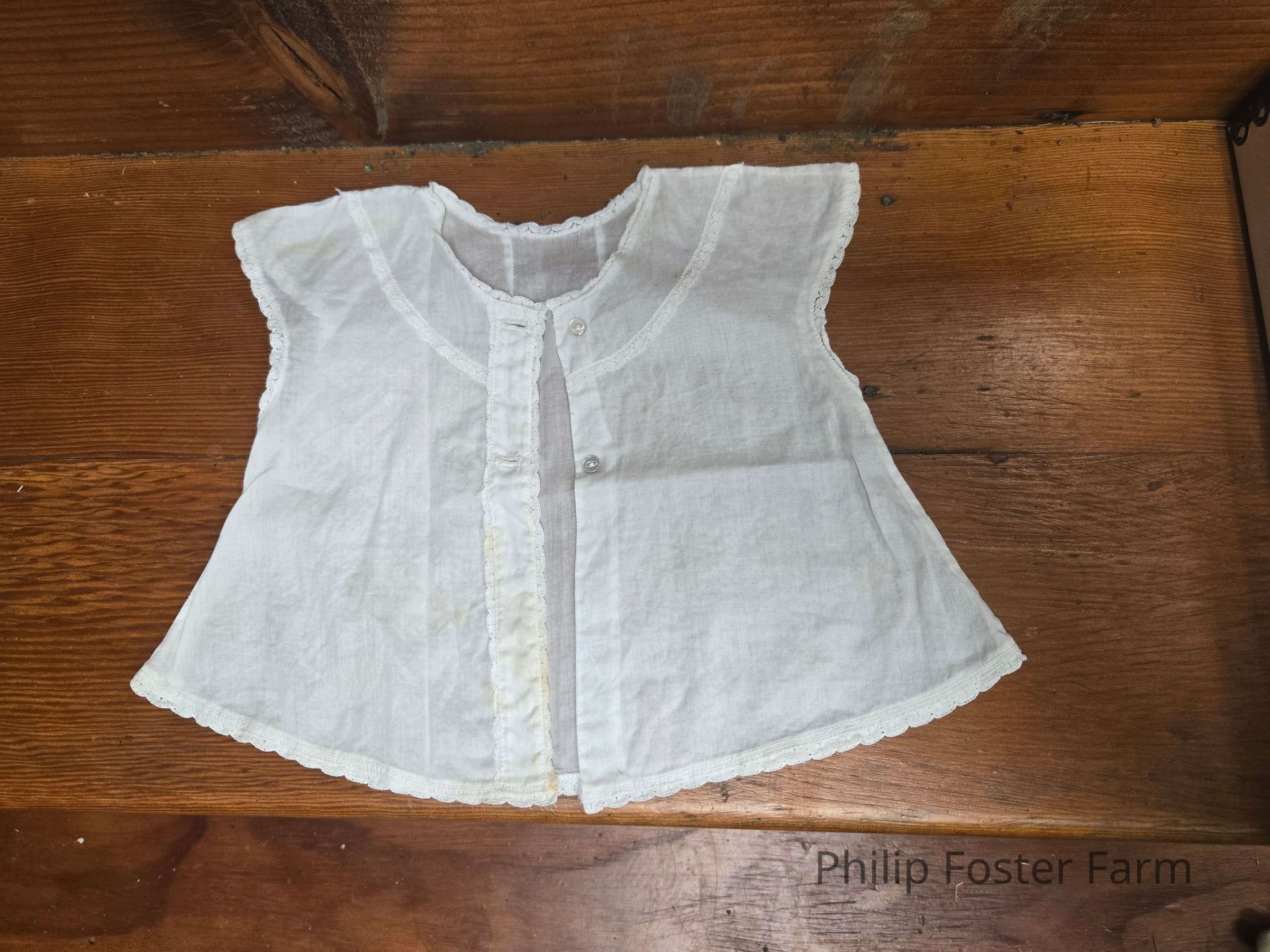 White linen shirt for doll. Lace trims, small stain on the placket.