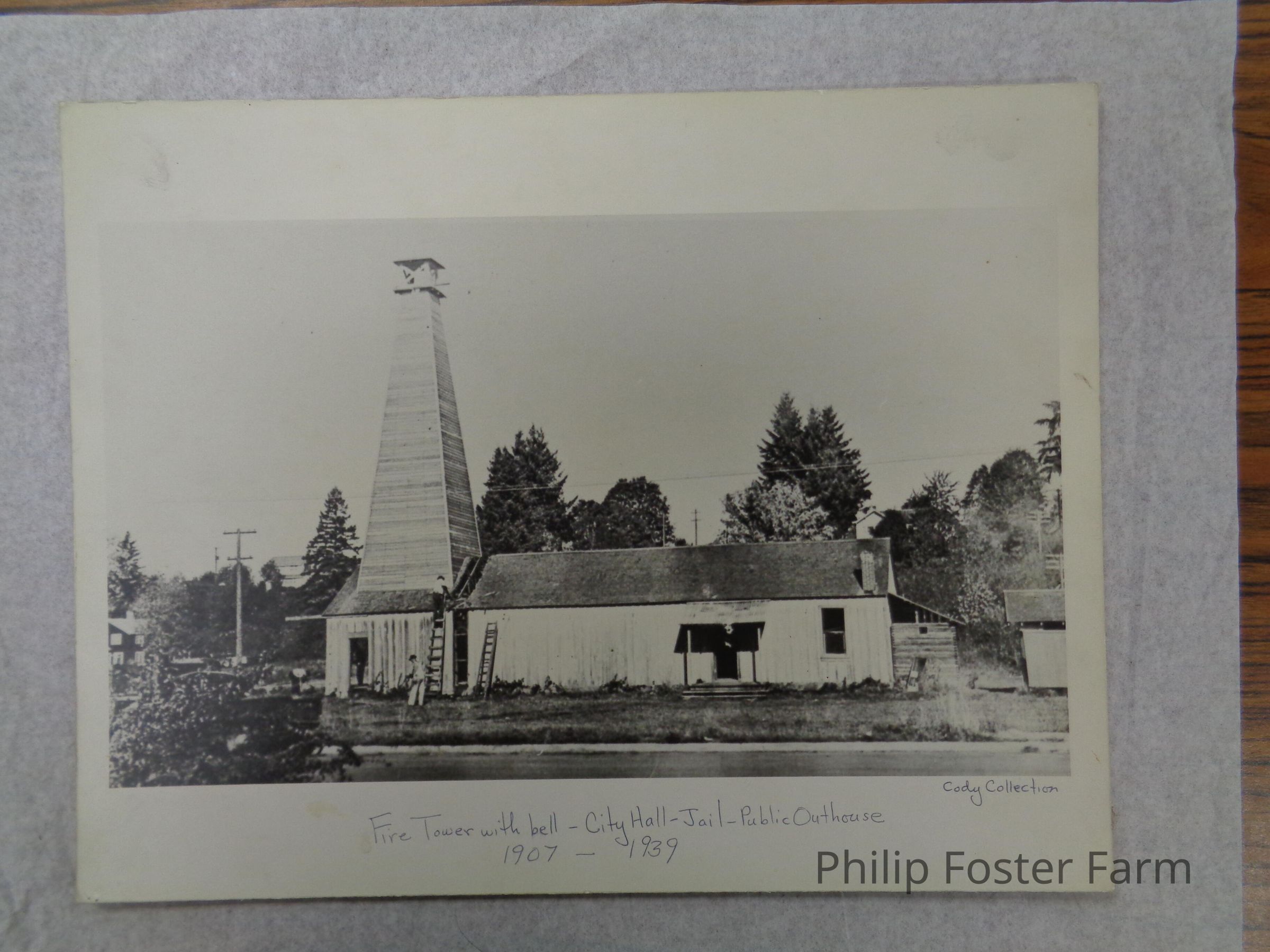 Text on bottom edge: Fire Tower with bell - City Hall - Jail - Public Outhouse. 1907 - 1939