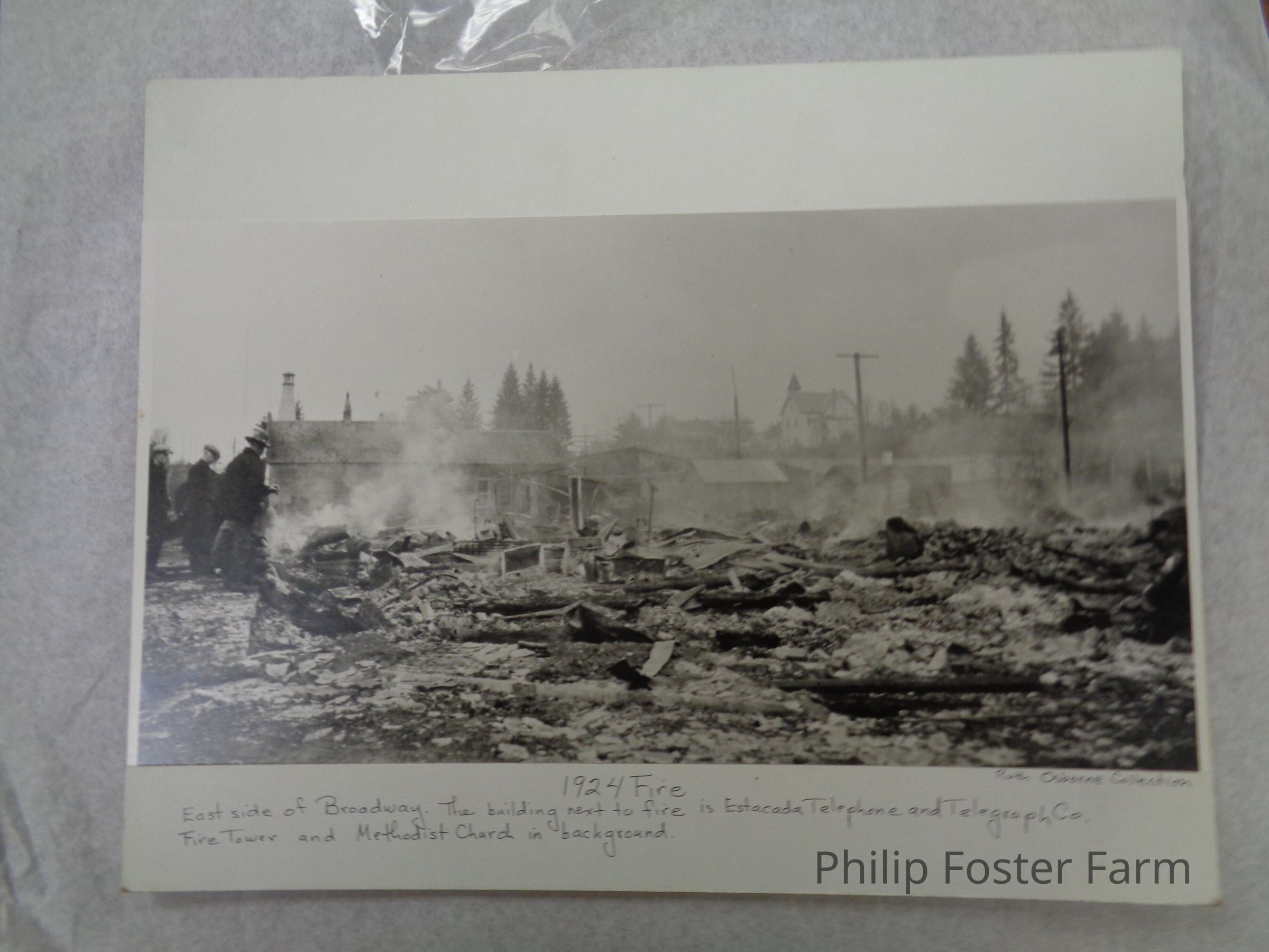 Text on bottom edge: 1924 Fire. East side of Broadway. The building next to the fire is Estacada Telephone and Telegraphy Co. Fire Tower and Methodist Church in background