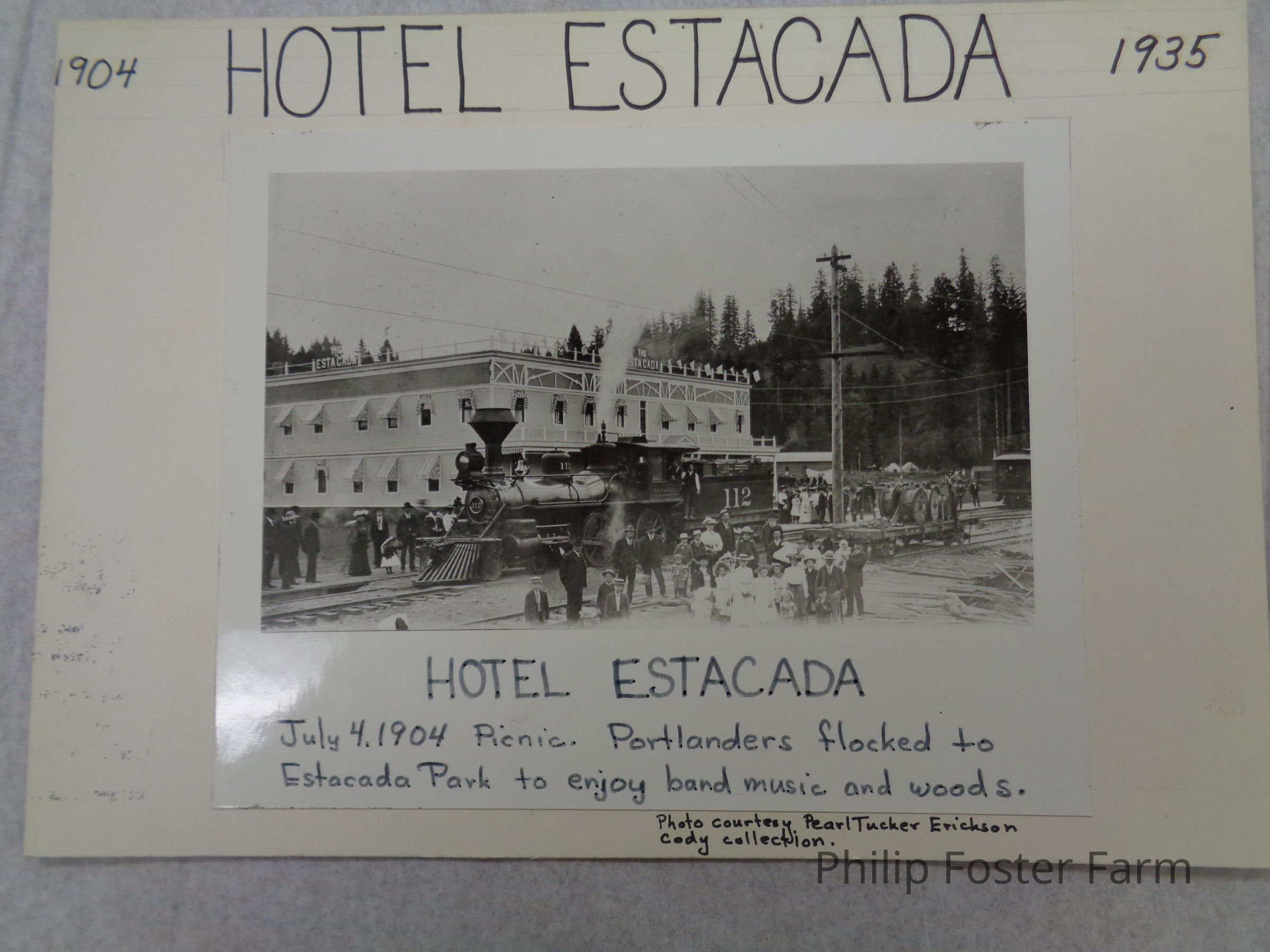 Text on bottom edge: HOTEL ESTACADA. July 4.1904 picnic. Portlanders flocked to Estacada Park to enjoy band music and woods.