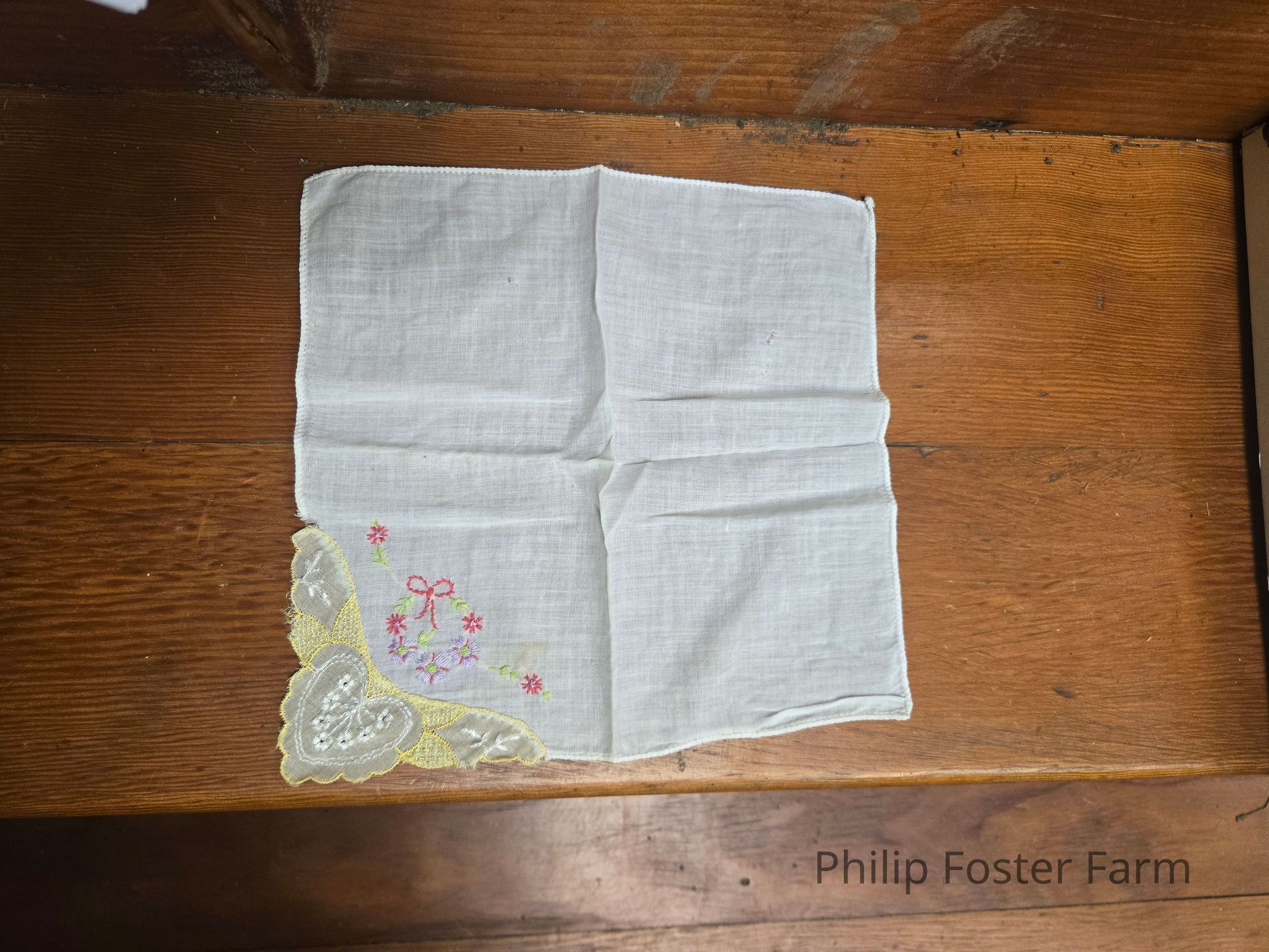 White linen semi-transparent handkerchief with a simple, pastel hand embroidery on one corner accompanied by a small yellow lace trim on the same corner.