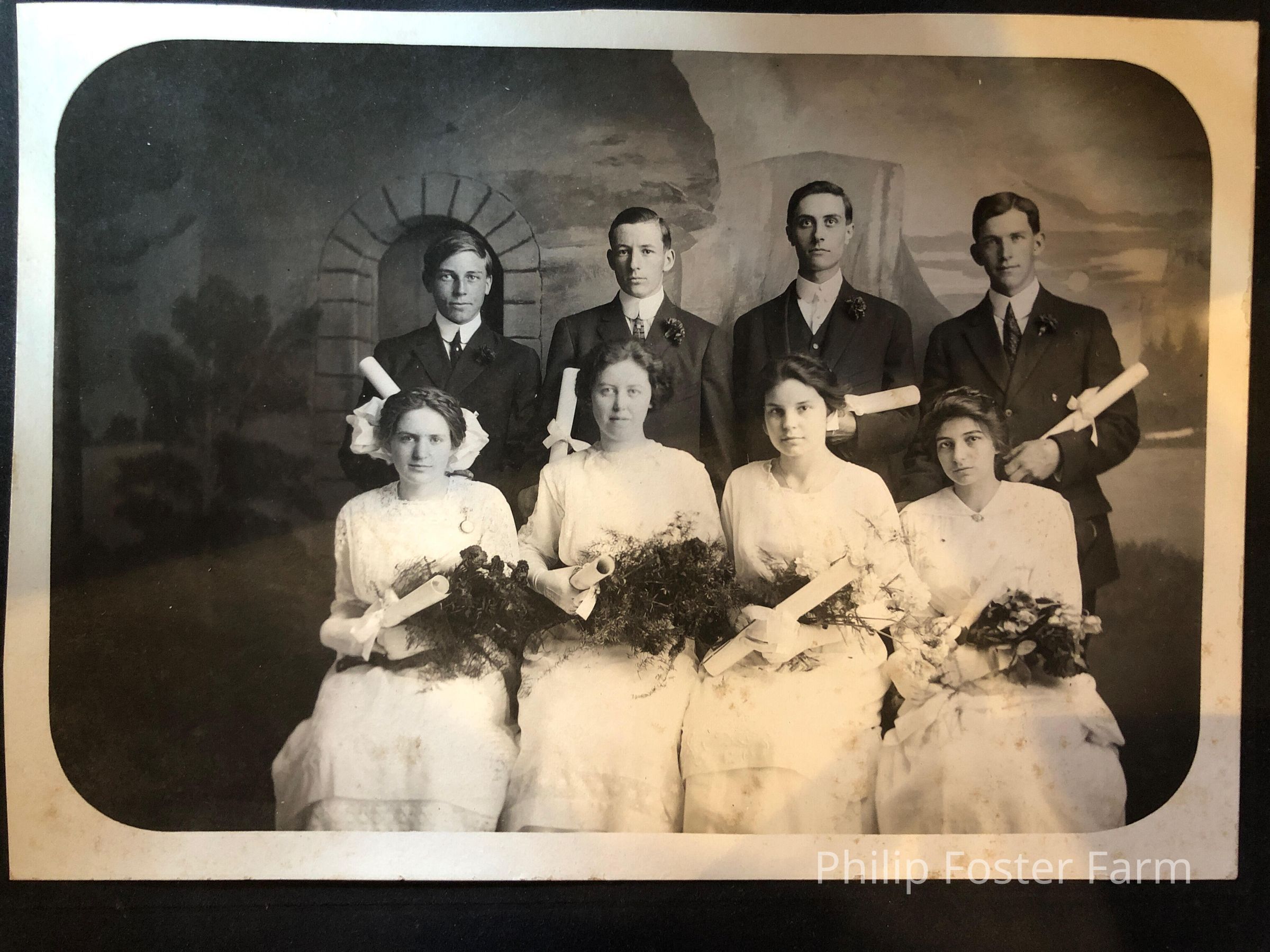 Writing on back: row 1: Malcom Woodle, Henry Morgan, Miltre Evans. Row 2: Irma Taylor, Rachael Reed, Mrytle Woodle, Down Lovel.